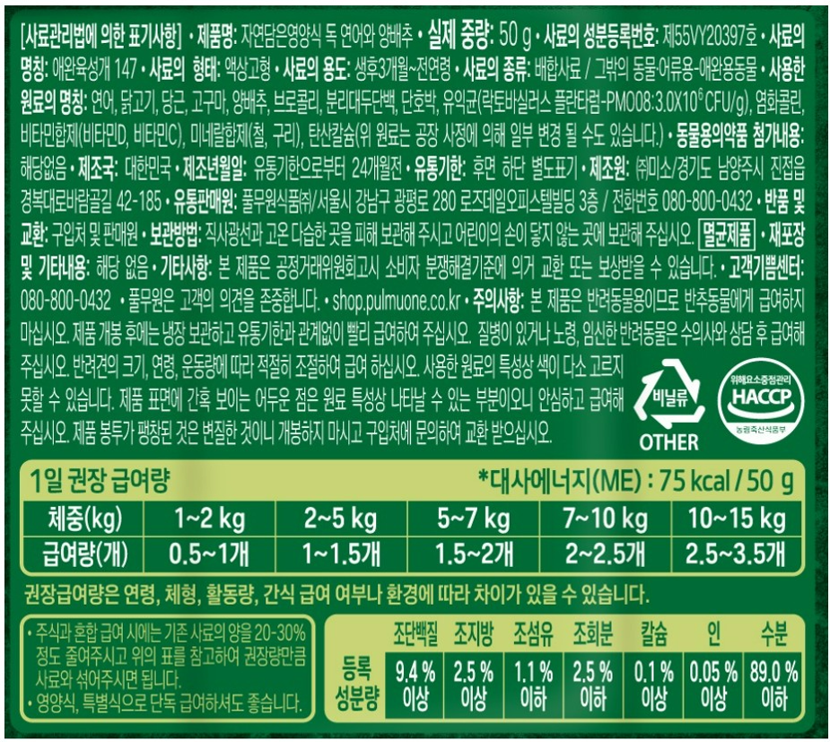 | 품명 및 모델명 | 자연담은 영양식 독 연어와 양배추 | 인증/허가 사항 | 사료관리법에 따른 성분등록번호 : 컨텐츠 참조 |