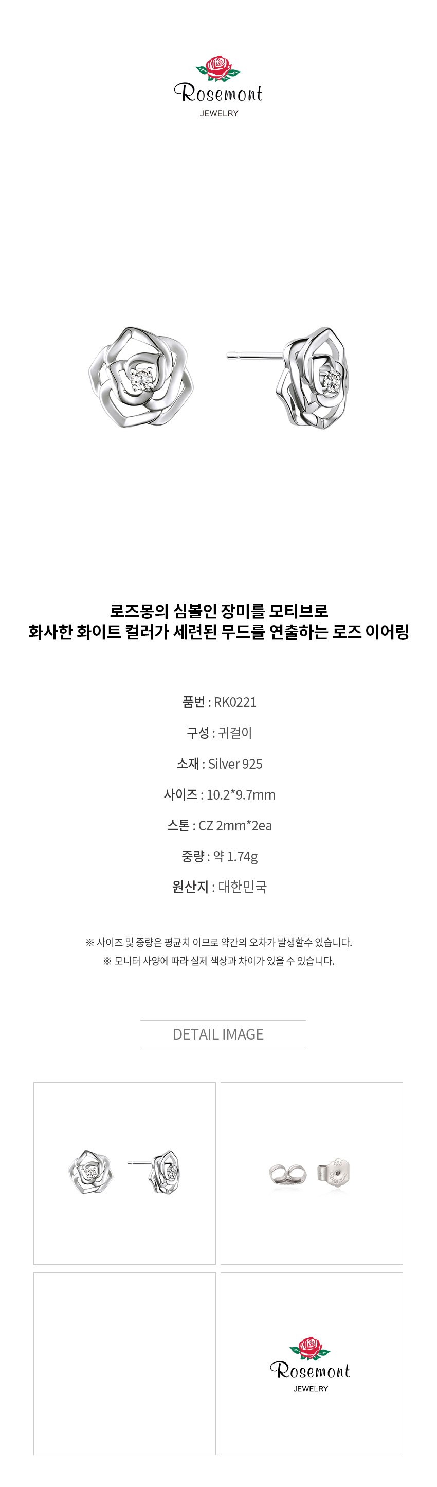 | 치수 | 컨텐츠 참조 | 착용 시 주의사항 | 착용 후 화장품, 땀, 습기, 지문 등의 이물질이 없도록 닦아서 폴리 백에 보관하시면 변색을 최소화할 수 있습니다. 온도가 높은 곳(사우나, 온천탕, 찜질방 등)이나 반대로 온도가 낮은 곳은 피해 주시길 바랍니다. 소재에 따라 습기, 마찰 등에 의해 색이 빠지거나 변색될 수 있으므로 보관에 주의해 주십시오. 향수 또는 스프레이 사용 시 주얼리에 닿지 않게 주의하여 주십시오. |