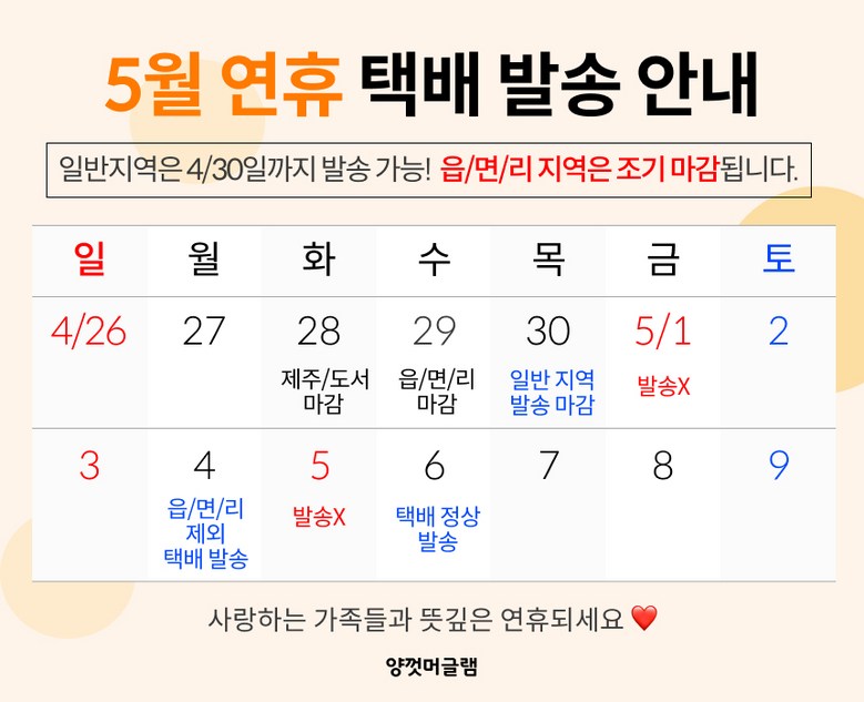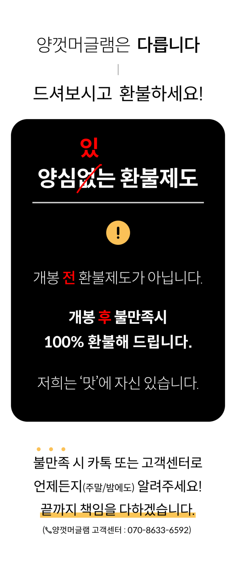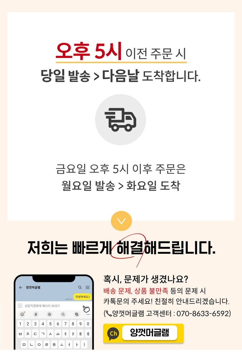 - ㆍ모니터 해상도의 차이로 인해 색상이나 이미지가 실제와 달라, 고객이 단순 변심으로 교환/반품을 무료로 요청하는 경우