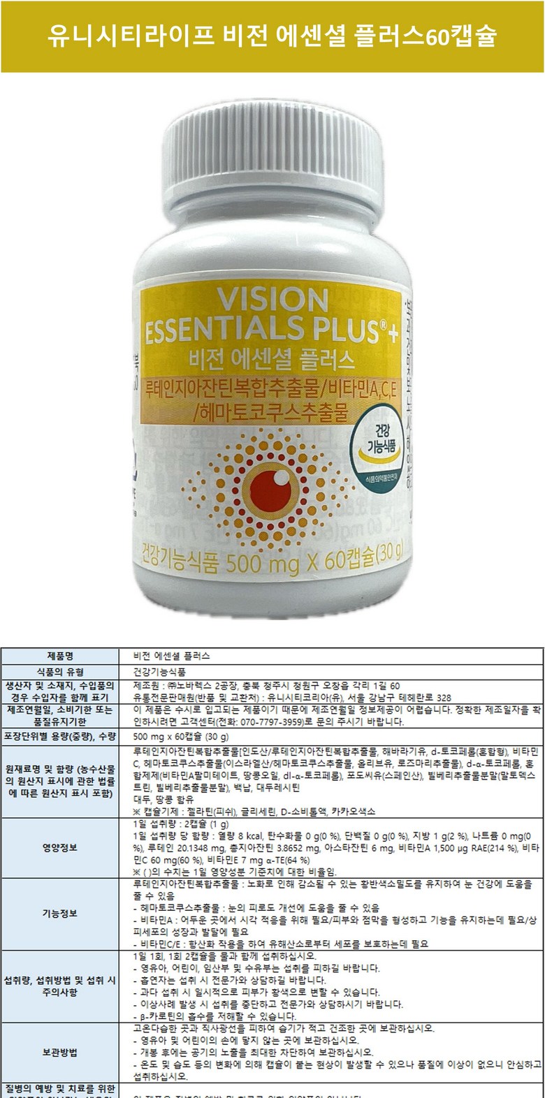 | 제품명 | 비전 에센셜 플러스 | 제조업소의 명칭과 소재지 | 제조원 : ㈜노바렉스 2공장, 충북 청주시 청원구 오창읍 각리 1길 60유통전문판매원(반품 및 교환처) : 유니시티코리아(유), 서울 강남구 테헤란로 328 |