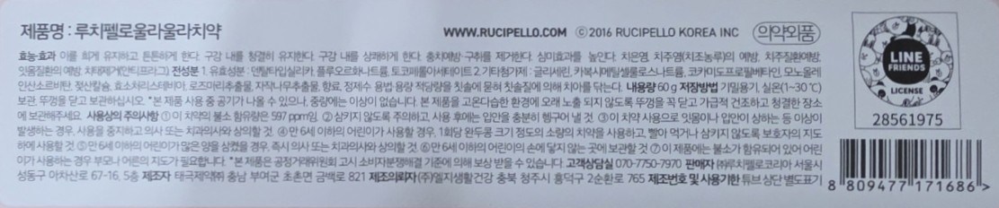 | 품명 및 모델명 | 루치펠로 울라울라 치약 | 인증/허가 사항 | 의약외품 |