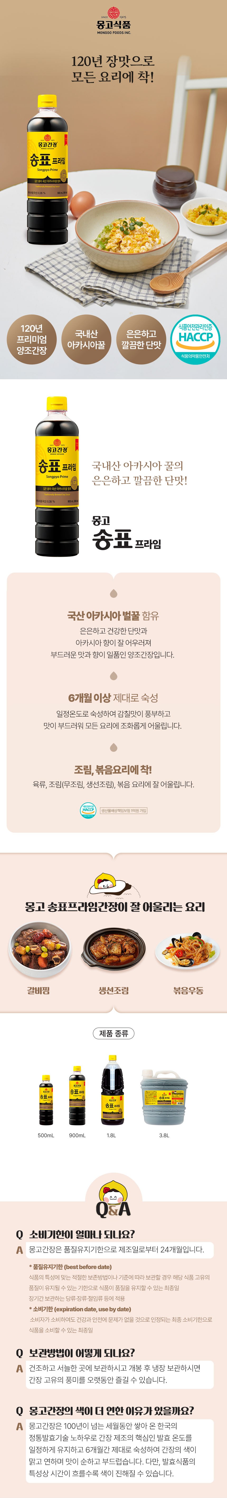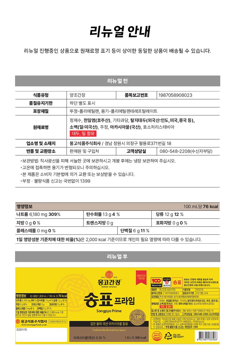 | 제품명 | 몽고간장 송표프라임 | 식품의 유형 | 컨텐츠 참조 |