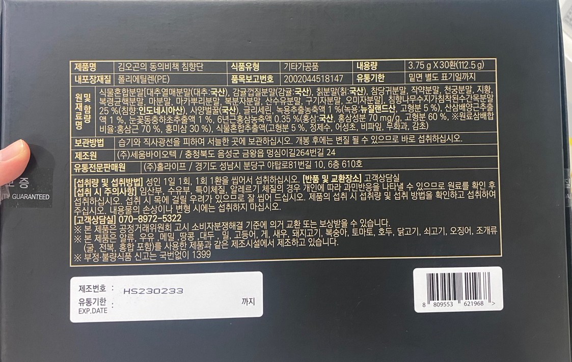 | 생산자 및 소재지 | 컨텐츠 참조 | 제조연월일, 소비기한 또는 품질유지기한 | 소비기한(또는 유통기한) : 2026년 11월 24일 이거나 그 이후인 상품 제조년월일 : 2024년 11월 25일 이후인 제조상품 |
