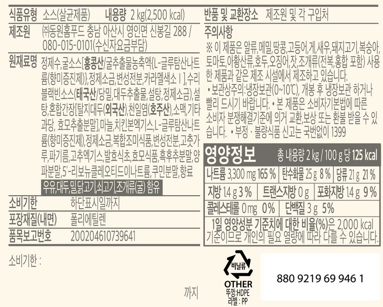| 제조연월일, 소비기한 또는 품질유지기한 | 상품 상세페이지 참조 | 세부 품목군별 표시사항 | 상품 상세페이지 참조 |