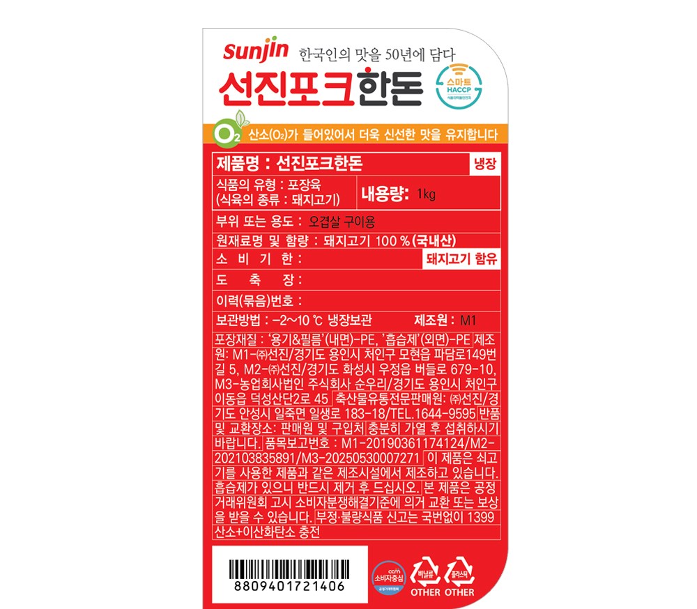 신선도를 유지하기 위해 MAP(Modified Atmospheres Packaging) 기법으로 포장했어요. 용기 내에 산소와 이산화탄소를 채워 고기의 맛과 품질을 유지합니다.