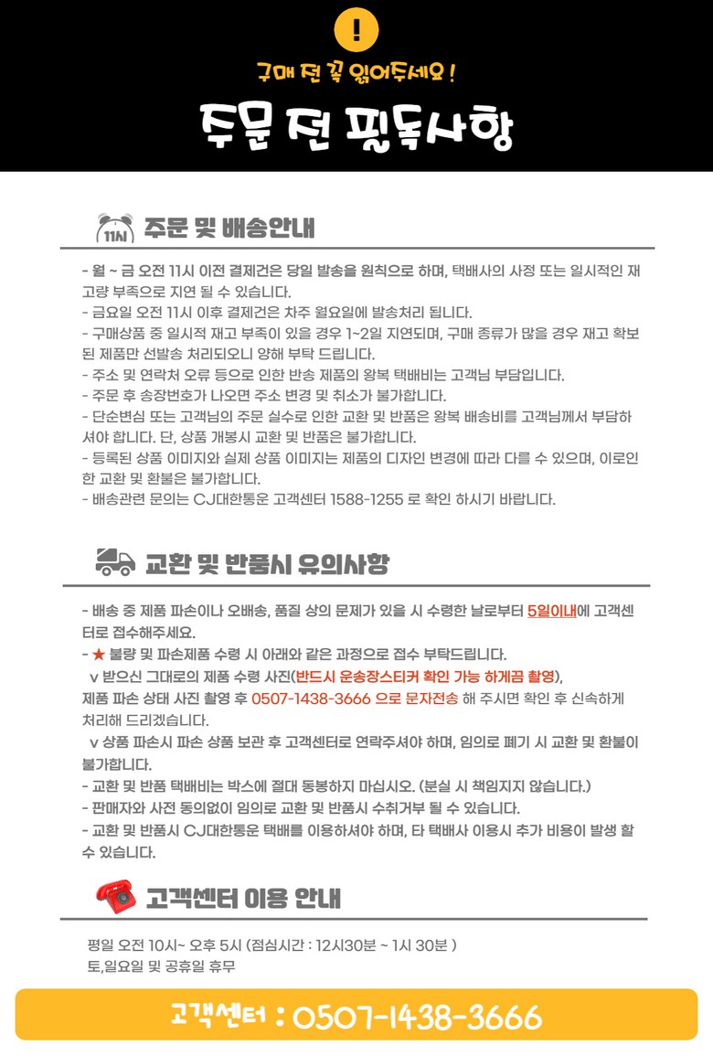 - ㆍ모니터 해상도의 차이로 인해 색상이나 이미지가 실제와 달라, 고객이 단순 변심으로 교환/반품을 무료로 요청하는 경우