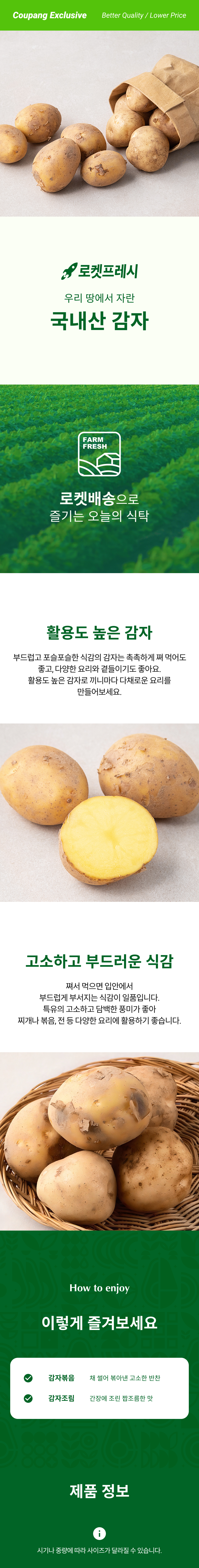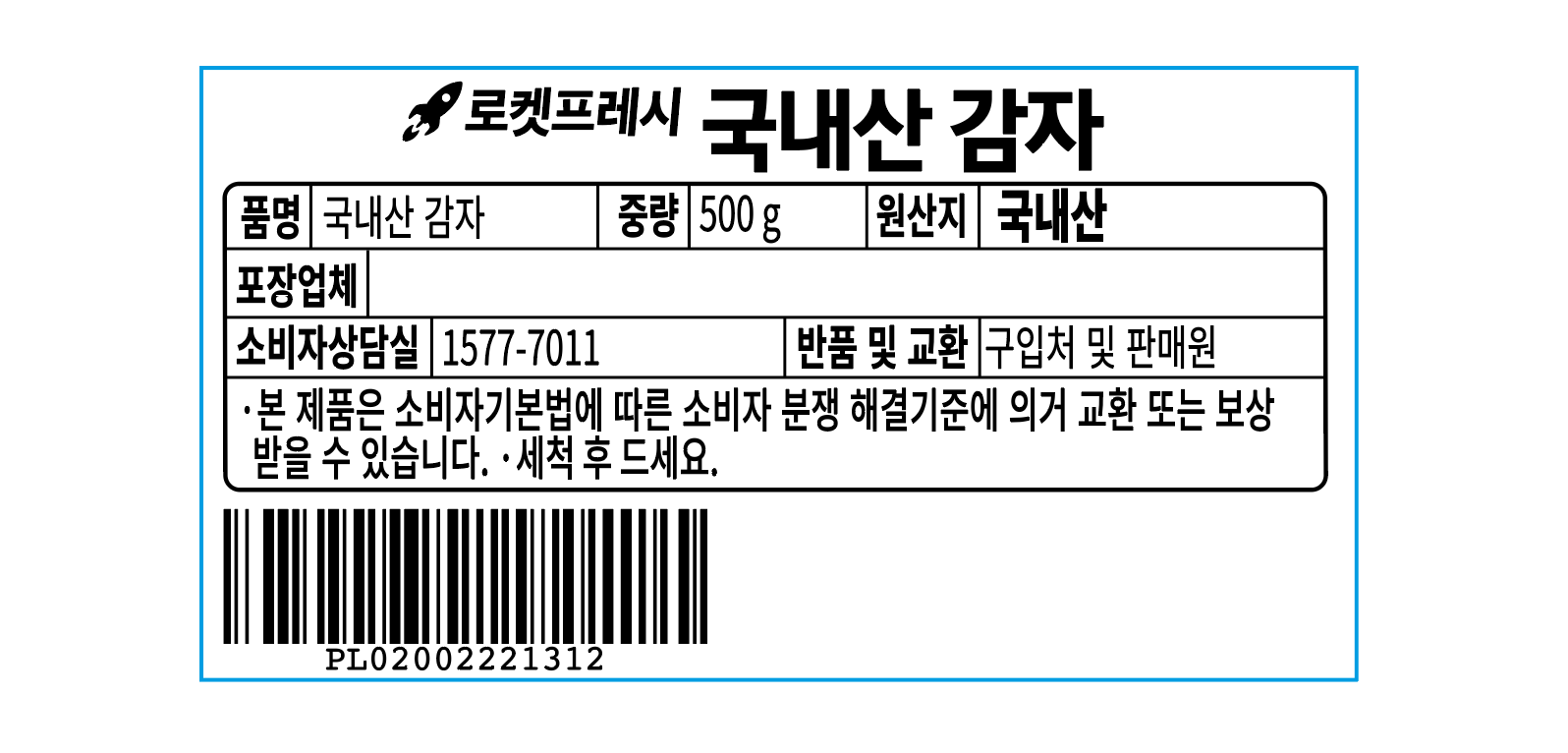 | 품목 또는 명칭 | 국내산 감자 | 포장단위별 내용물의 용량(중량),수량,크기 | 500gx1개 |