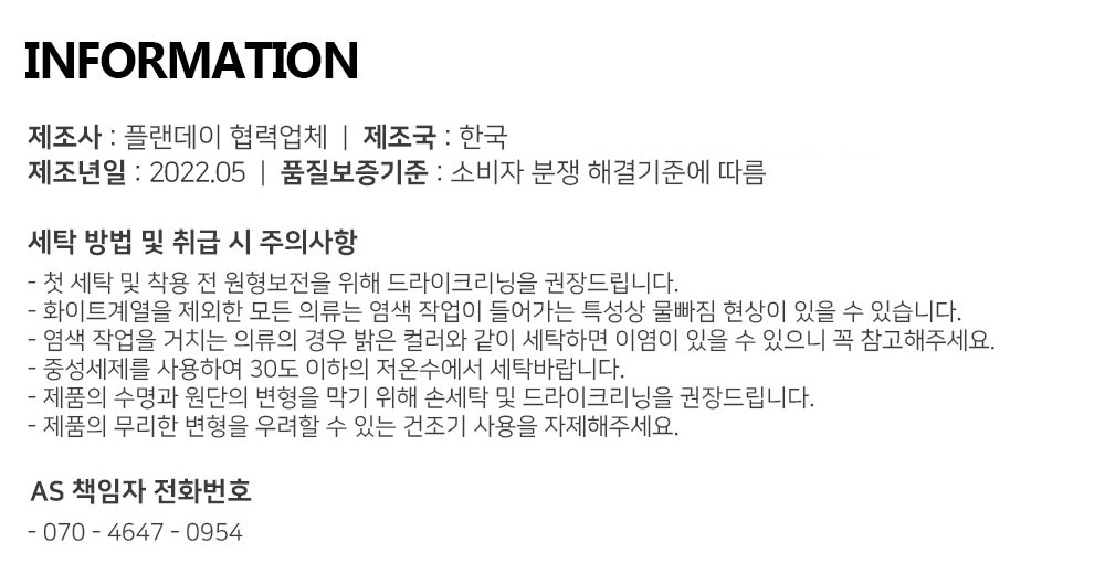 | 제조국 | 한국 | 세탁방법 및 취급시 주의사항 | 컨텐츠 참조 |