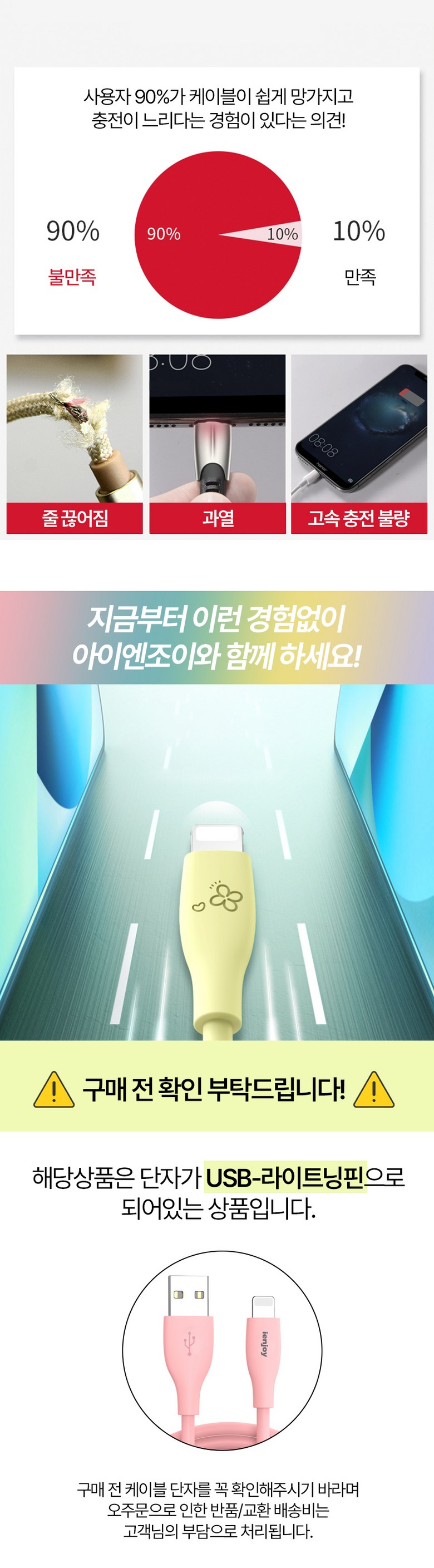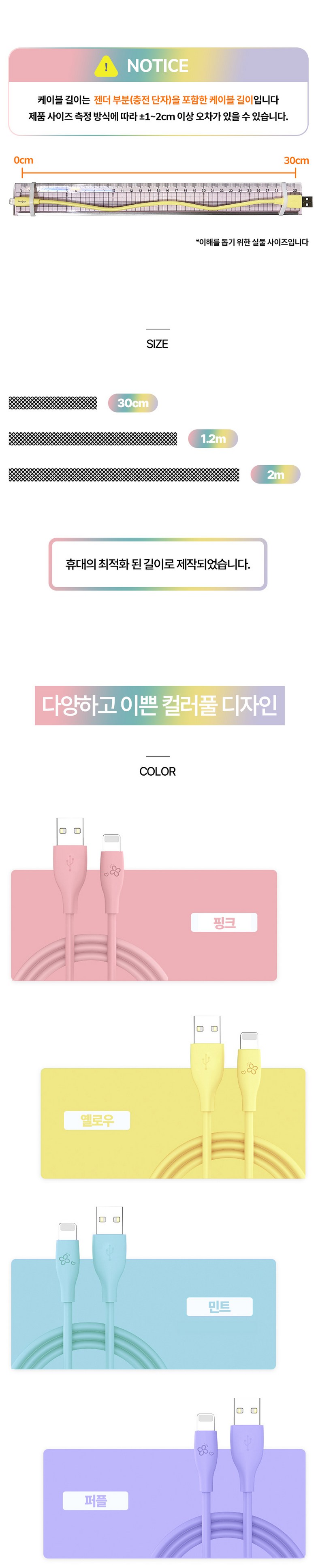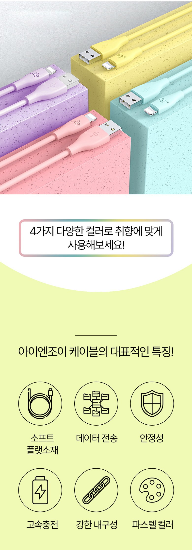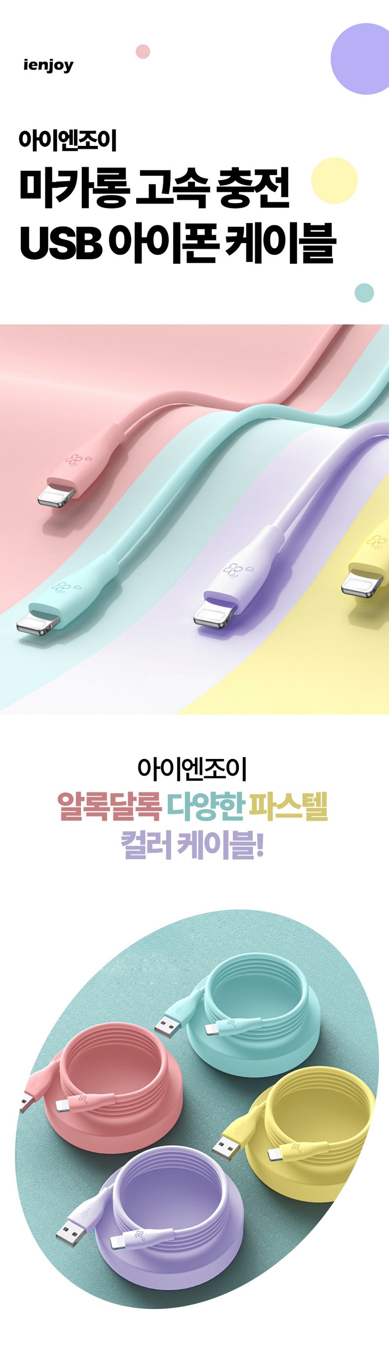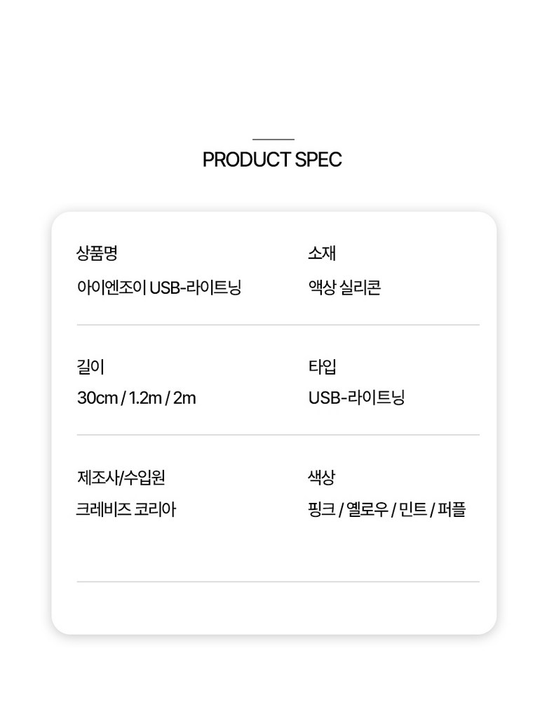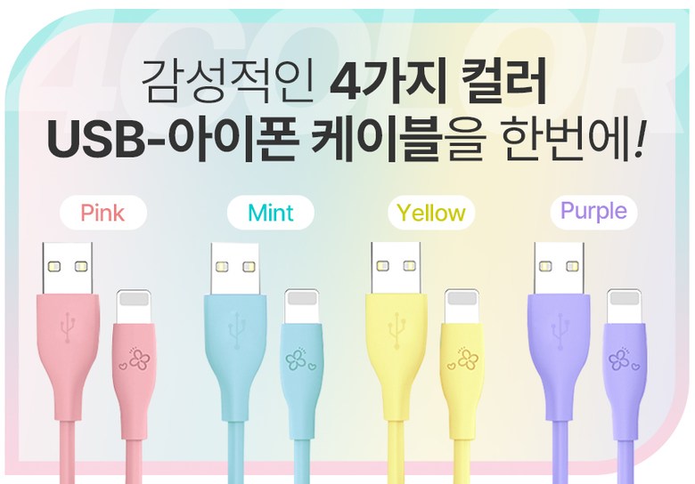 | 품명 및 모델명 | 아이엔조이 마카롱 고속 충전 USB 아이폰 케이블 혼합색 4개입 | 인증/허가 사항 | 해당없음 |