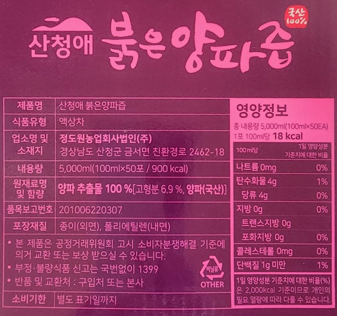 | 제품명 | 산청애 붉은양파즙 | 식품의 유형 | 액상차 |