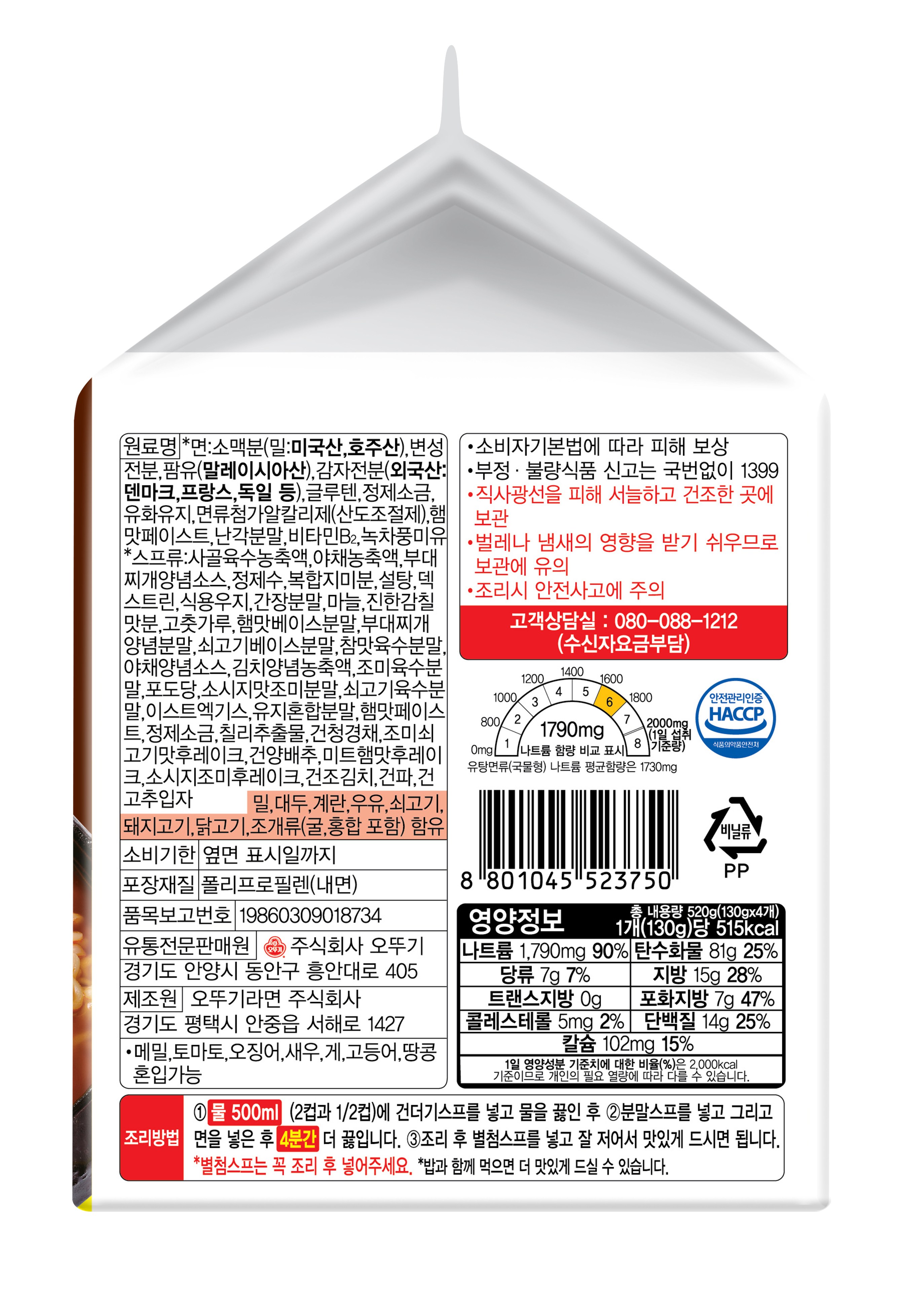 | 생산자 및 소재지 | 오뚜기/ 경기도 평택시 안중읍 덕우로 423 | 제조연월일, 소비기한 또는 품질유지기한 | 소비기한(또는 유통기한) : 2026년 04월 09일 이거나 그 이후인 상품 제조년월일 : 2025년 10월 12일 이후인 제조상품 |