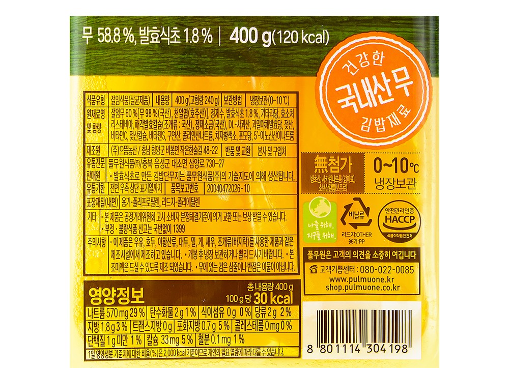 | 제품명 | 발효식초로 만든 김밥단무지 | 식품의 유형 | 컨텐츠참조 |