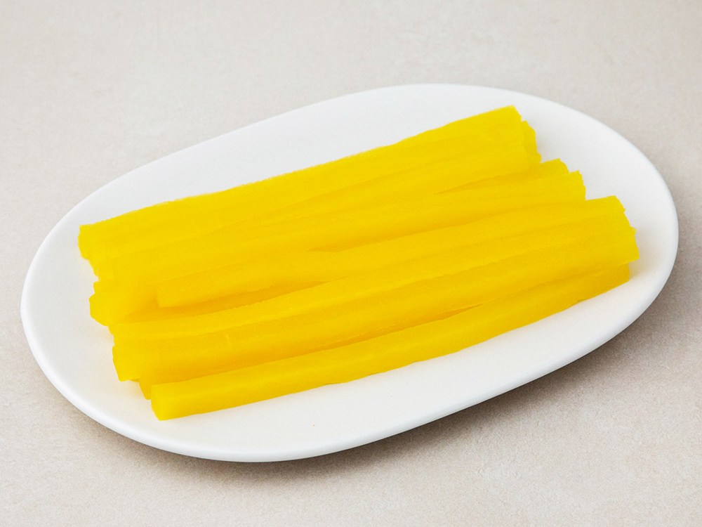 김밥에 빠지지 않는 재료, 단무지예요. 샛노란 색상이 김밥에 색감을 더해 맛깔스럽게 보이게 하죠. 아삭아삭한 식감과 새콤달콤한 풍미를 느낄 수 있어요. 다채로운 재료와 함께 김밥을 만들어 신나는 식사 시간을 즐겨보세요.