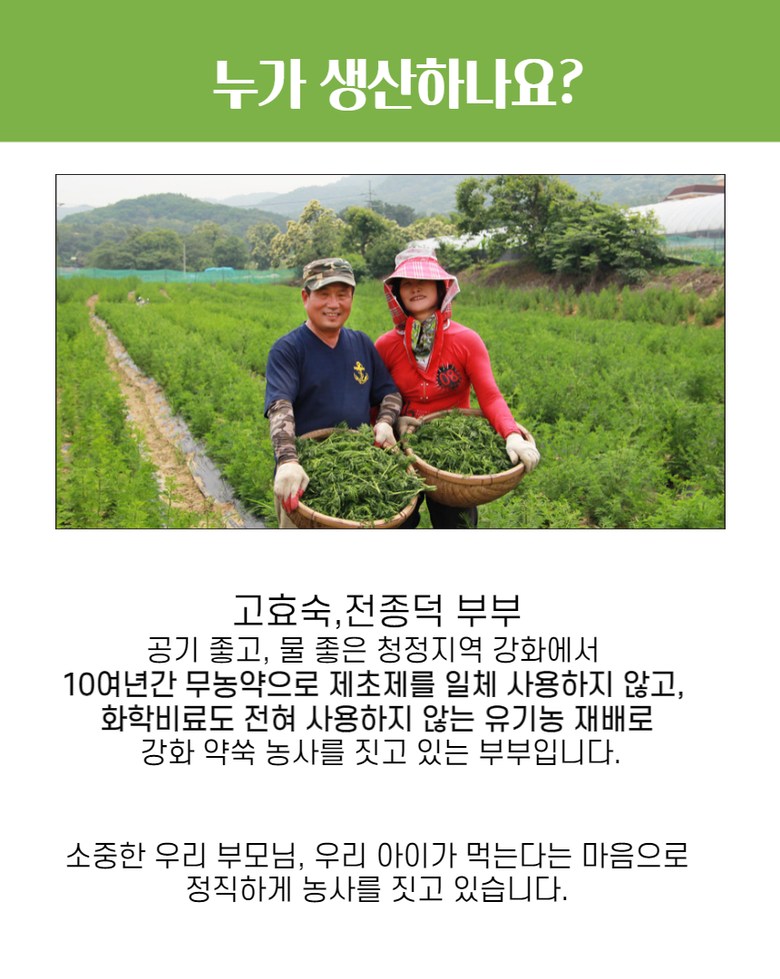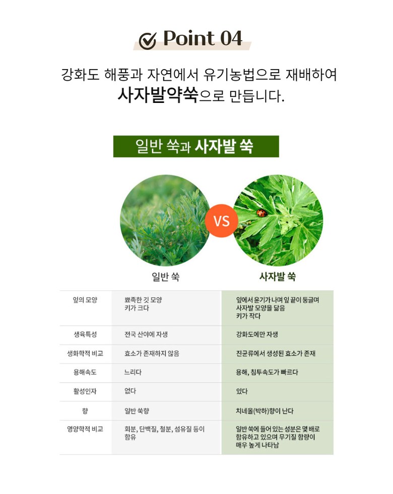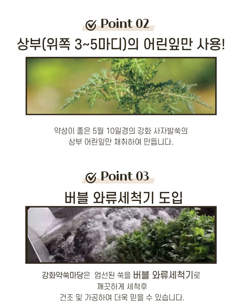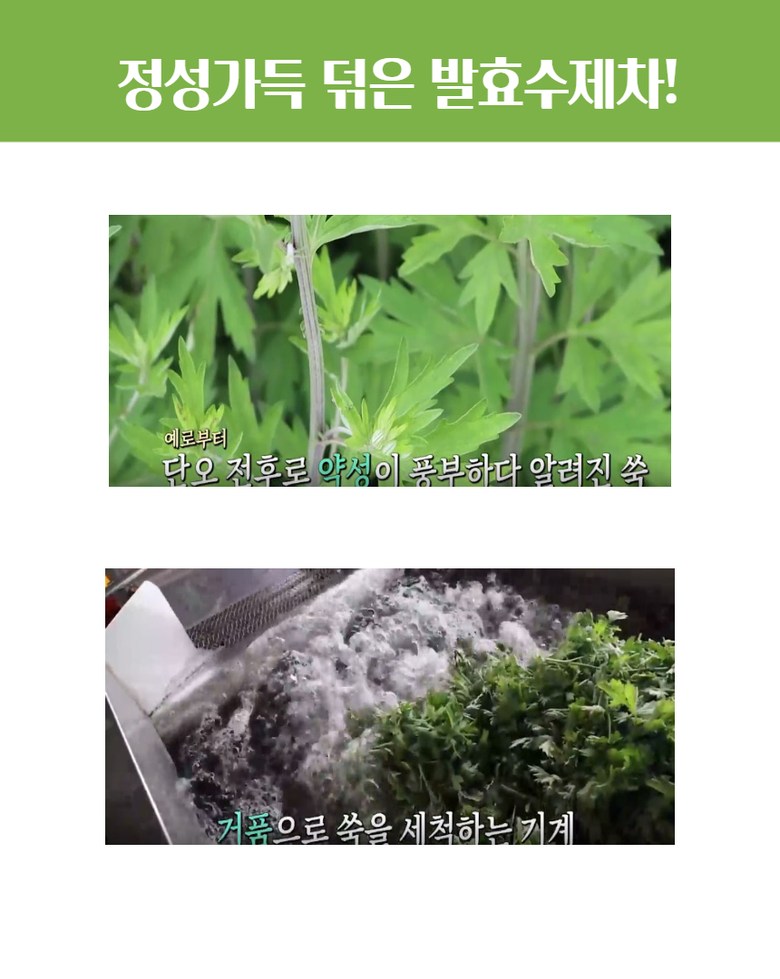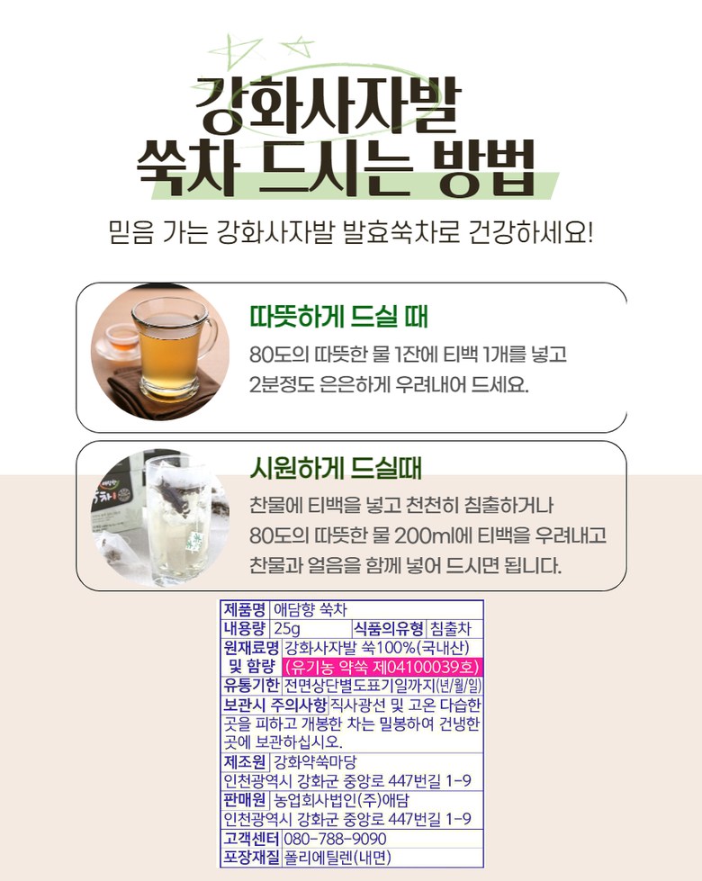 | 생산자 및 소재지 | 강화약쑥마당 애담, 인천시 강화군 | 제조연월일, 소비기한 또는 품질유지기한 | 제조일로부터 2년 |