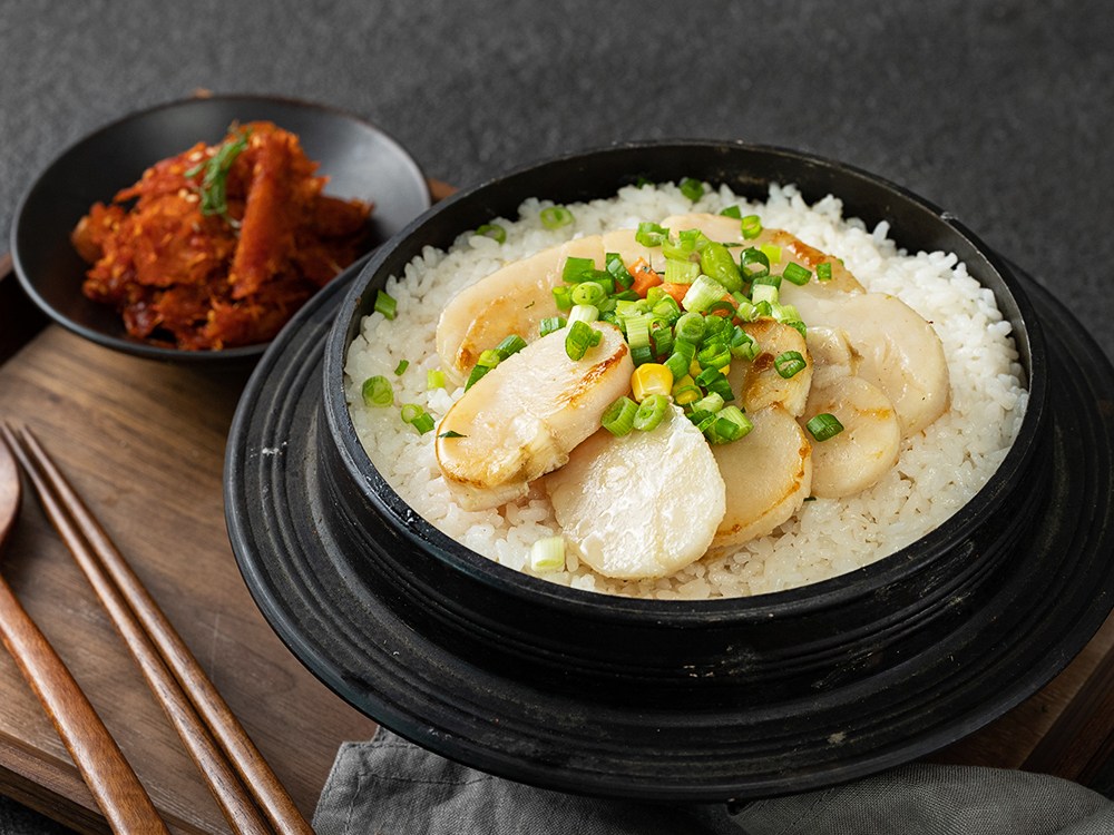 4. 완성된 밥에 관자를 올리고 5분 정도 뜸을 들입니다.