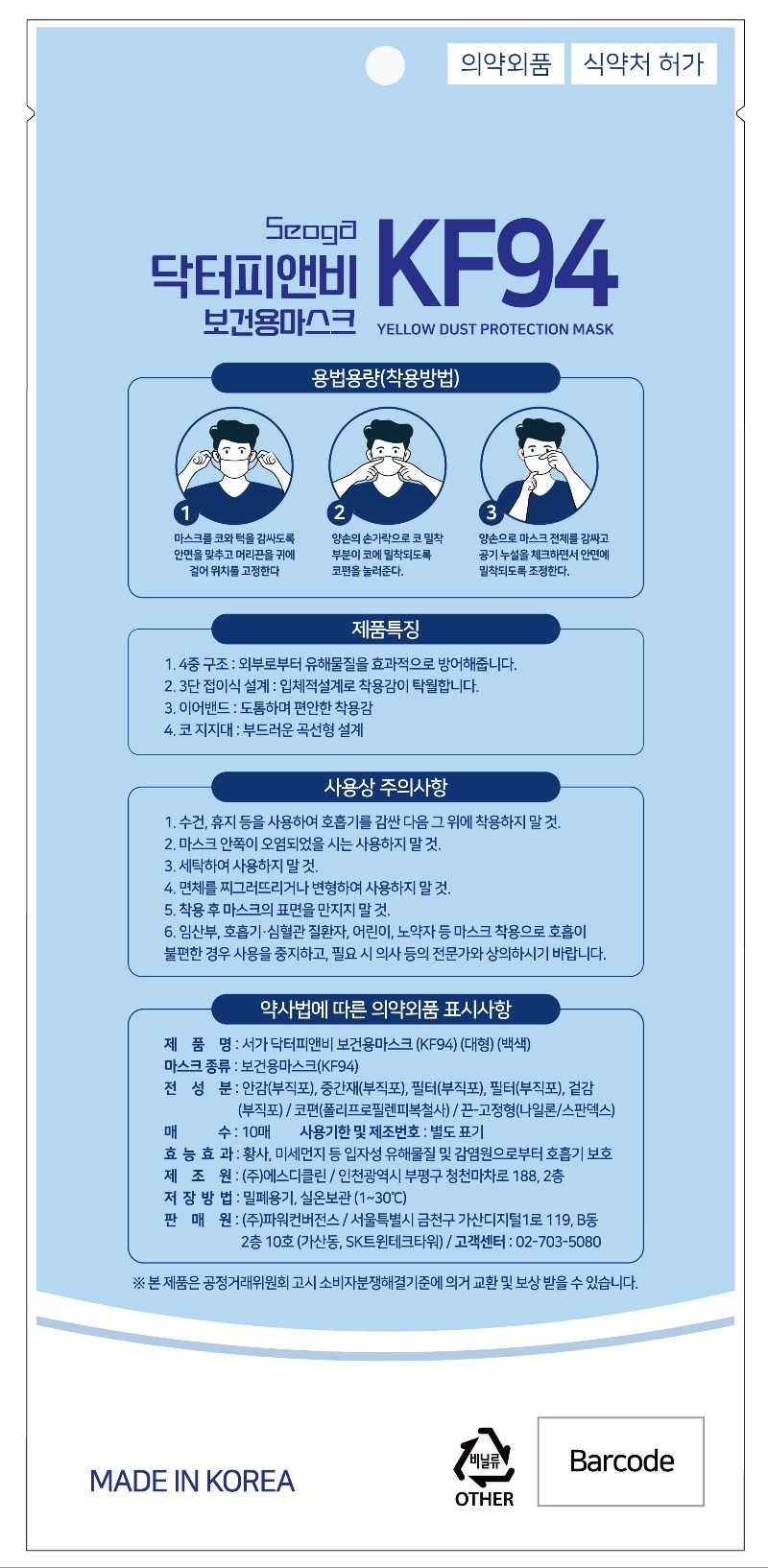 | 품명 및 모델명 | 서가닥터피앤비보건용마스크(KF94)(대형)(백색) | 인증/허가 사항 | 의약외품 |