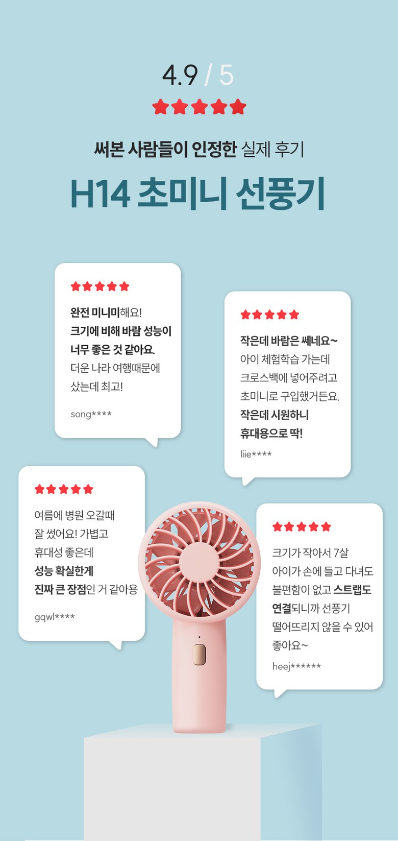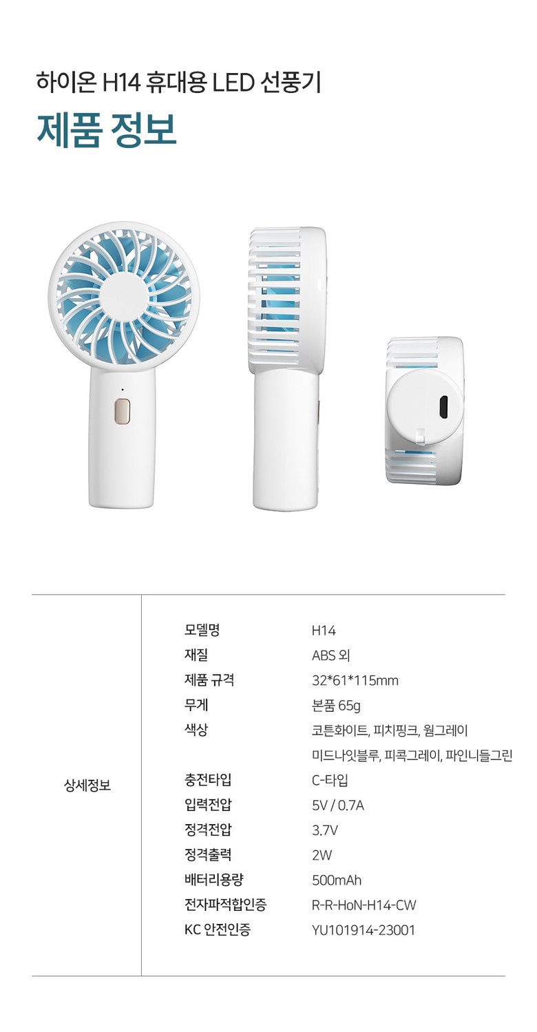 | 품명 및 모델명 | 하이온 H14 미니 몬스터 무선 휴대용 선풍기 / H14-CW , H14-WG , H14-PG , H14-OG , H14-MB , H14-PK | KC 인증정보 | 본품 : R-R-HoN-H14-CW / 전지 : XU101694-18001A |