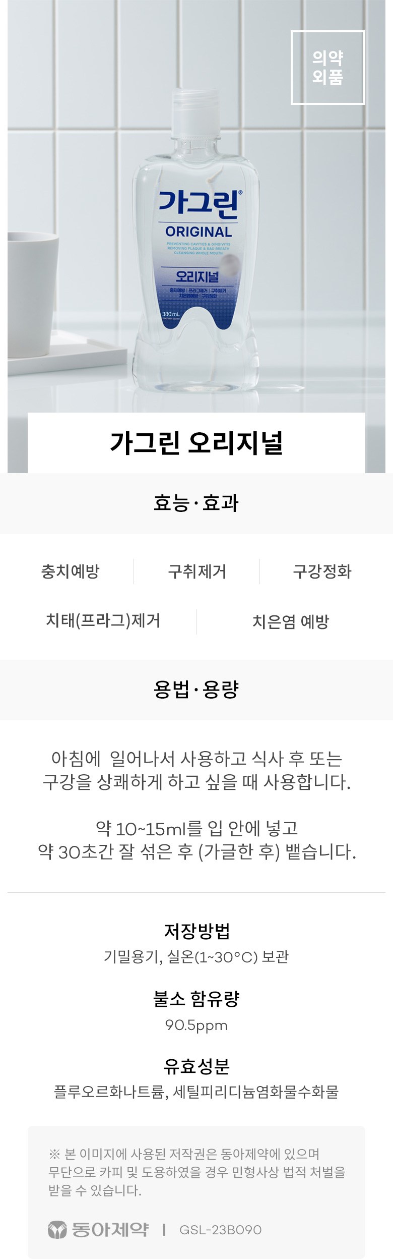 | 품명 및 모델명 | 가그린 오리지널 | 인증/허가 사항 | 의약외품 |