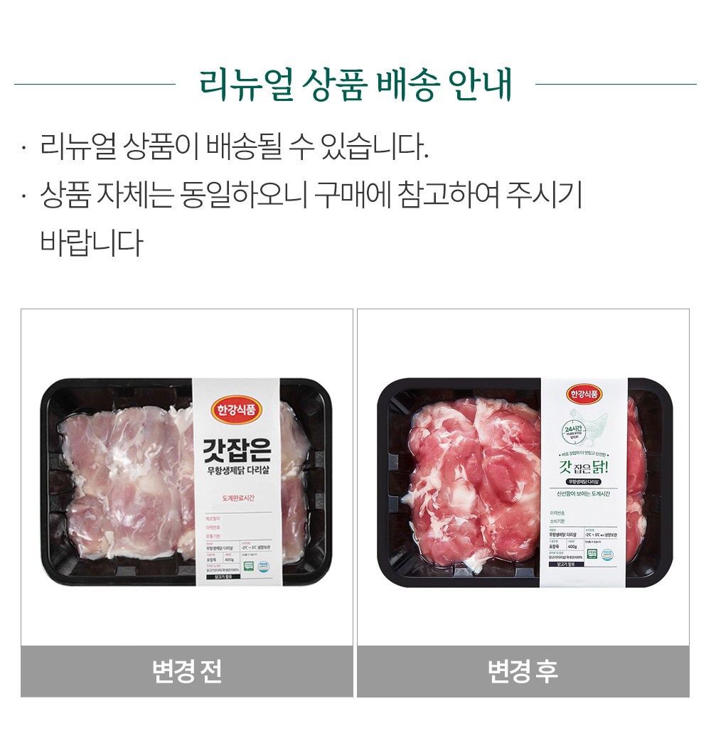 닭고기 본연의 뛰어난 맛과 향을 온전히 전하기 위해, 건강하게 키운 닭을 갓 잡아 신선한 상태 그대로 보내드립니다. 특히, 패키지에 기재된 '도계 완료 시간'은 신선함을 보증하는 한강식품의 자신감이기도 합니다. 쫄깃하고 야들야들한 닭다리 살코기만을 깔끔하게 손질해 담아 부드러운 식감을 오롯이 즐기실 수 있어요. 정성으로 완성한 닭다리살로 요리의 품격을 한 단계 더 높여보세요.