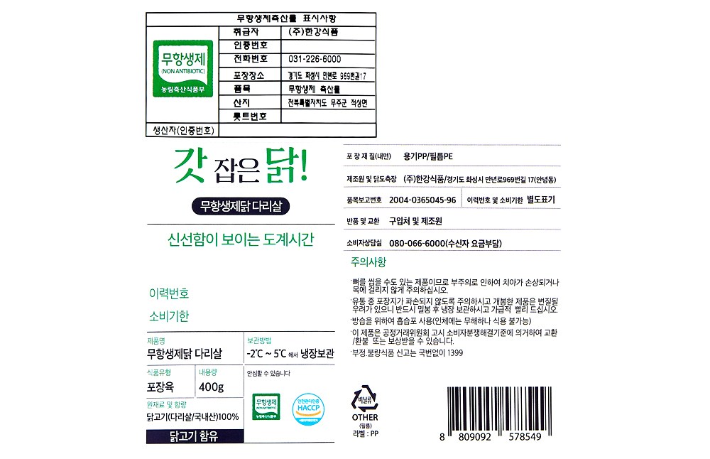 | 제조연월일, 소비기한 또는 품질유지기한 | 주문일 기준으로 제조 또는 포장되므로 해당 정보가 매번 변경되어 정확한 정보 제공이 어렵습니다. 정확한 제조연월일을 확인하시려면 쿠팡 고객센터(1577-7011)로 문의 바랍니다. | 세부 품목군별 표시사항 | 축산물 등급표시: 해당없음 / 이력번호 표시유무 : 이력번호 표시제품임 |