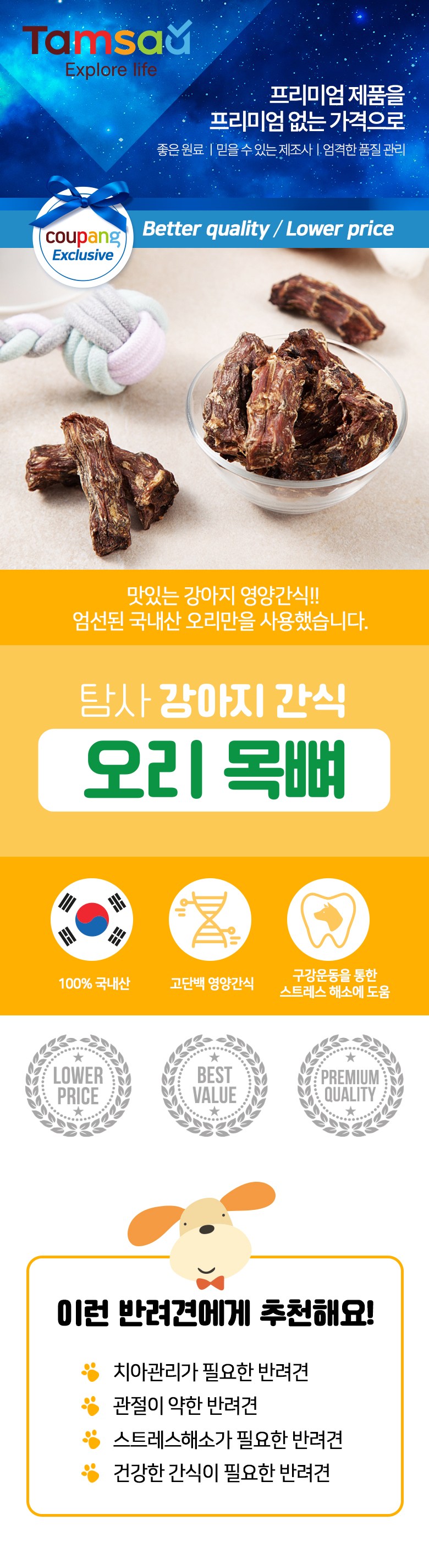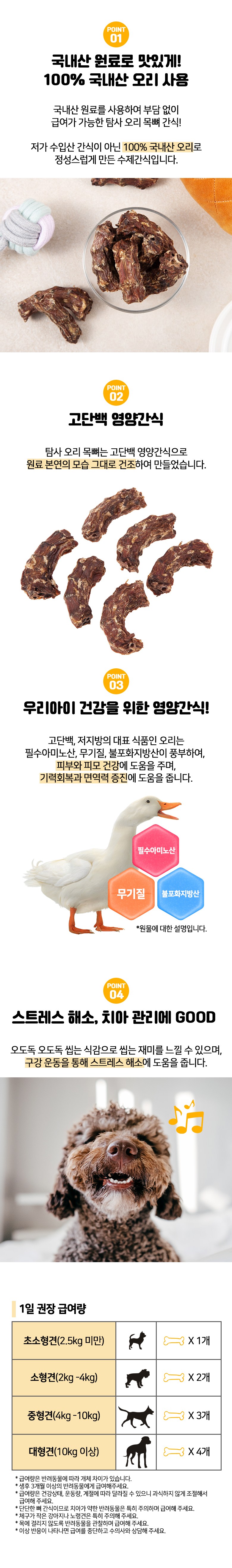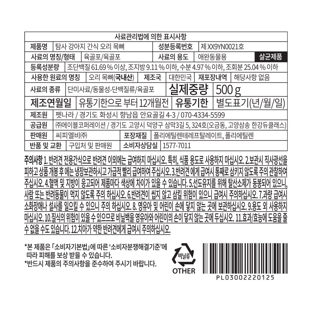 | 품명 및 모델명 | 탐사 강아지 간식 육포 오리 목뼈, 500 g | 인증사항 | 사료관리법에 따른 성분등록번호 : 컨텐츠 참조 |