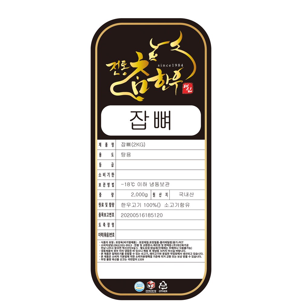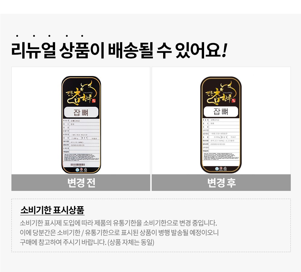 | 품목 또는 명칭 | 잡뼈(2KG) | 포장단위별 내용물의 용량(중량),수량,크기 | 2,000g, 1개 |