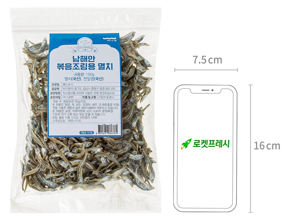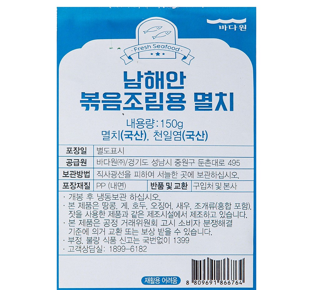 | 품목 또는 명칭 | 남해안 볶음조림용 멸치 | 포장단위별 내용물의 용량(중량),수량,크기 | 150g x 2개,1개 |