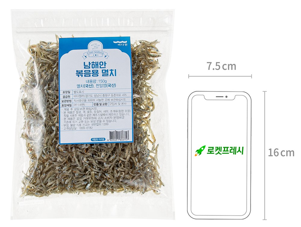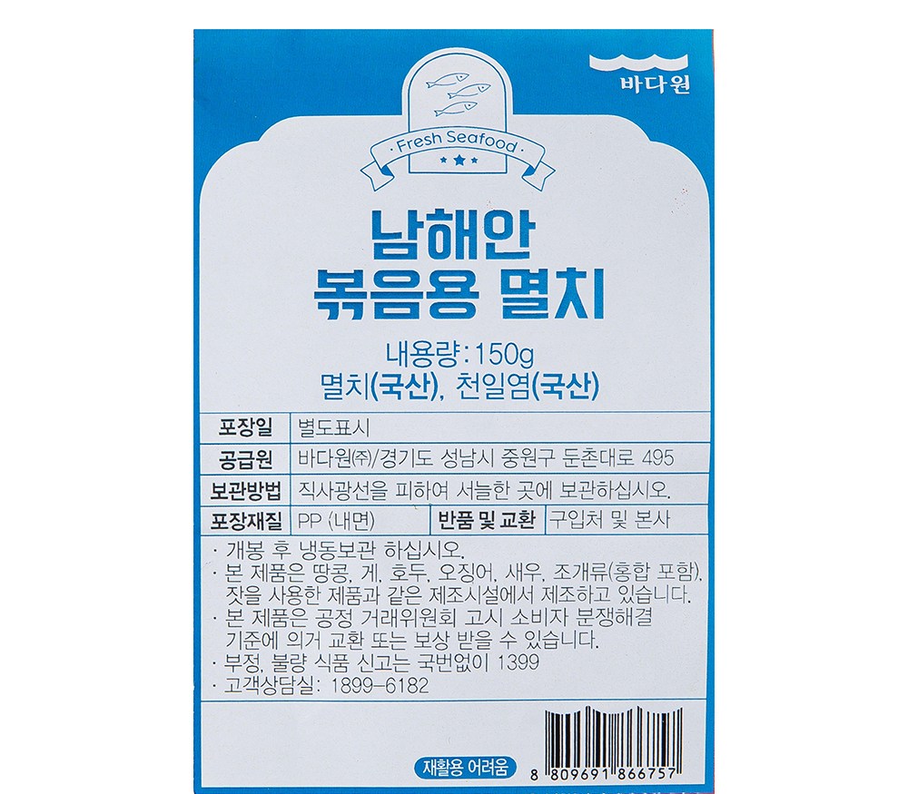 | 품목 또는 명칭 | 남해안 볶음용 멸치 | 포장단위별 내용물의 용량(중량),수량,크기 | 150g x 6개,1개 |