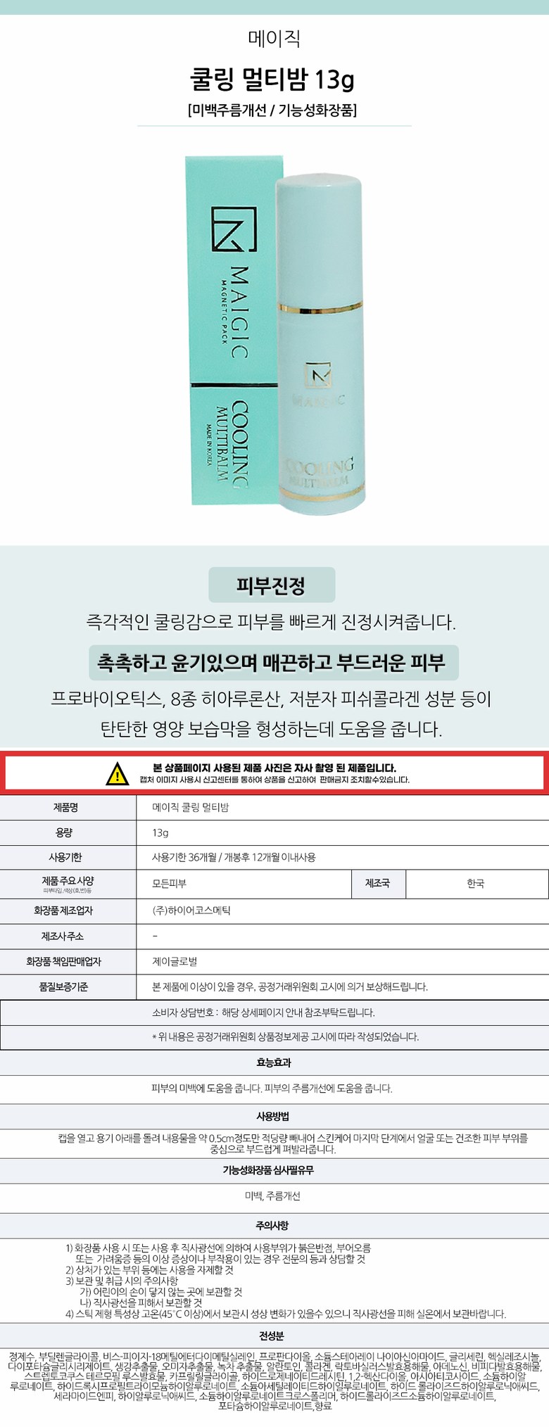 | 화장품제조업자, 화장품책임판매업자 및 맞춤형화장품판매업자 | 상품 상세페이지 참조 | 제조국 | 상품 상세페이지 참조 |