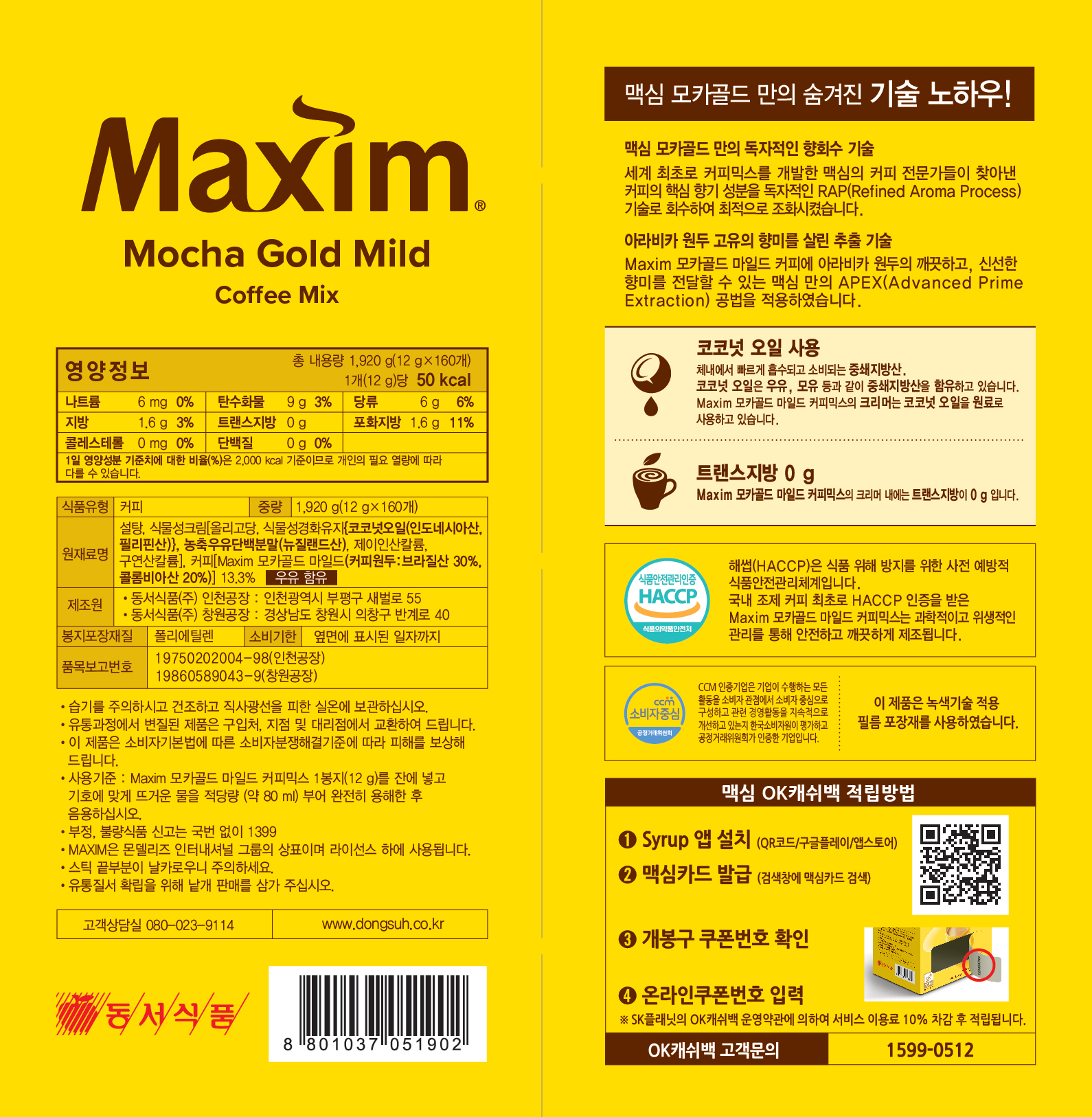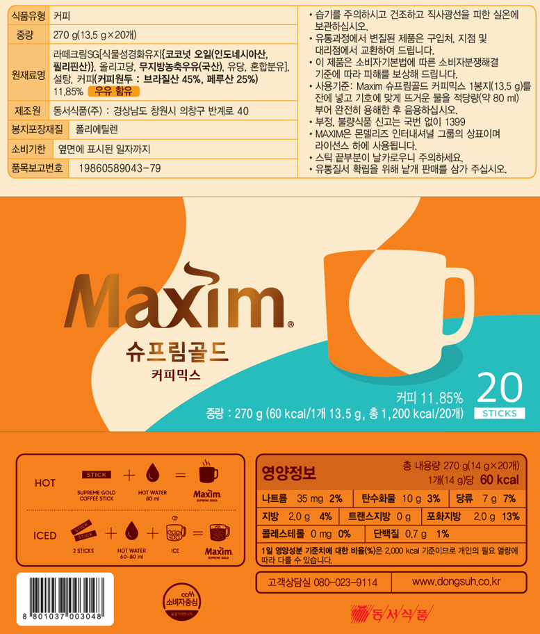 | 제품명 | Maxim 모카골드 마일드 커피믹스 + Maxim 슈프림골드 커피믹스 | 식품의 유형 | 컨텐츠 참조 |