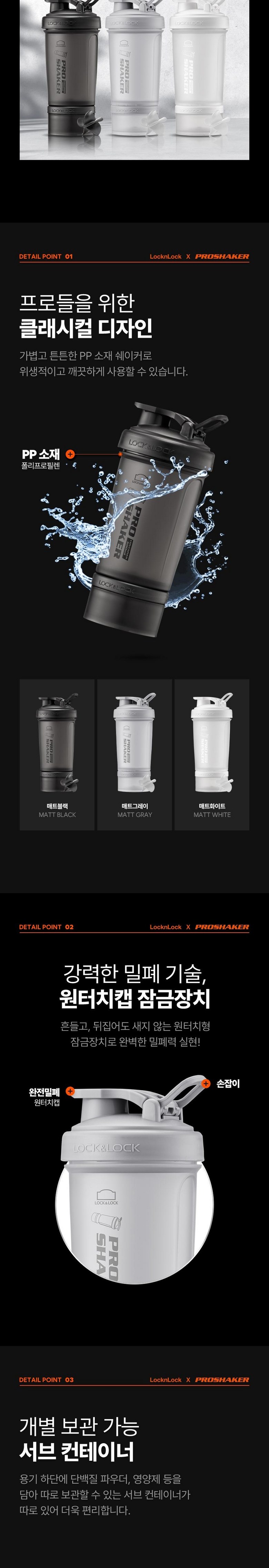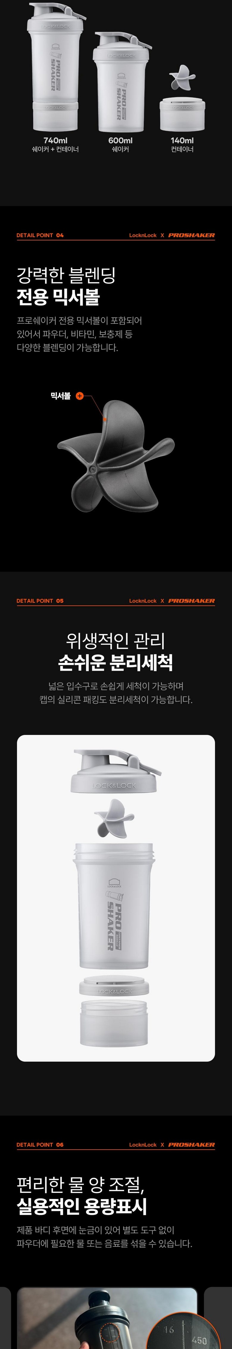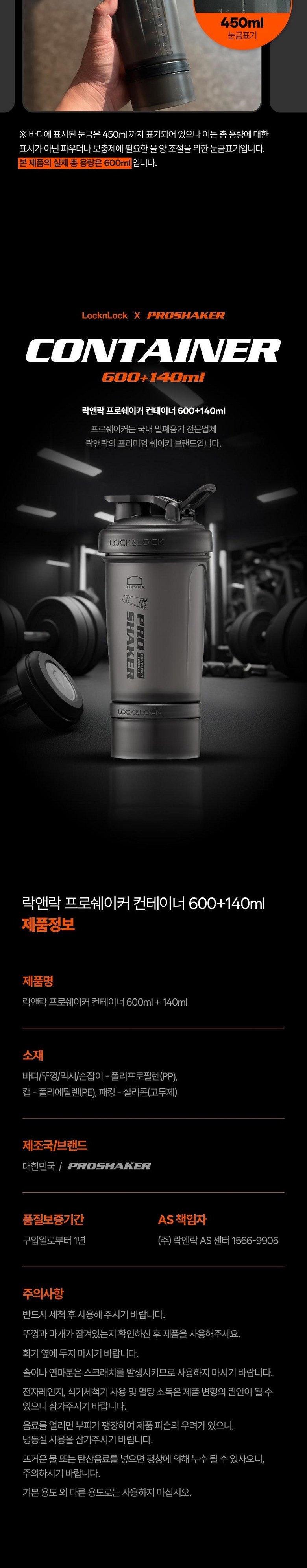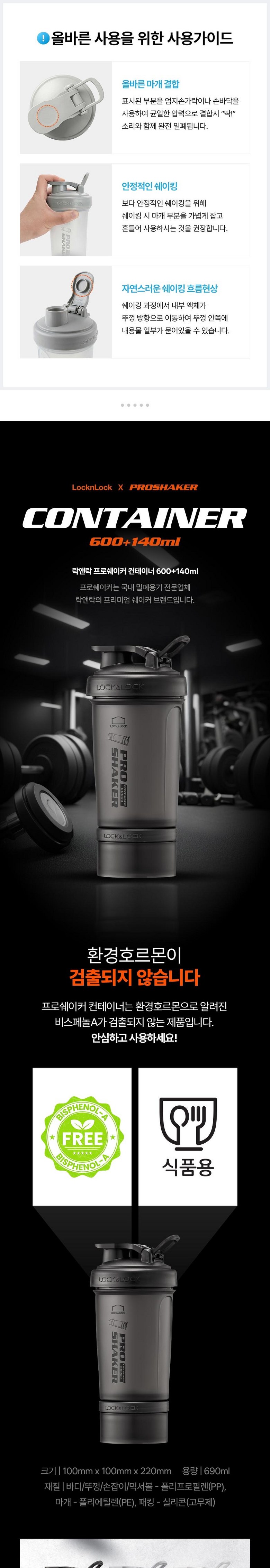 | 구성품 | 프로쉐이커 보틀 600ml + 컨테이너 140ml | 크기 | 22cm(높이) x 9.5cm(상단가로) x 7.5cm(하단가로) |