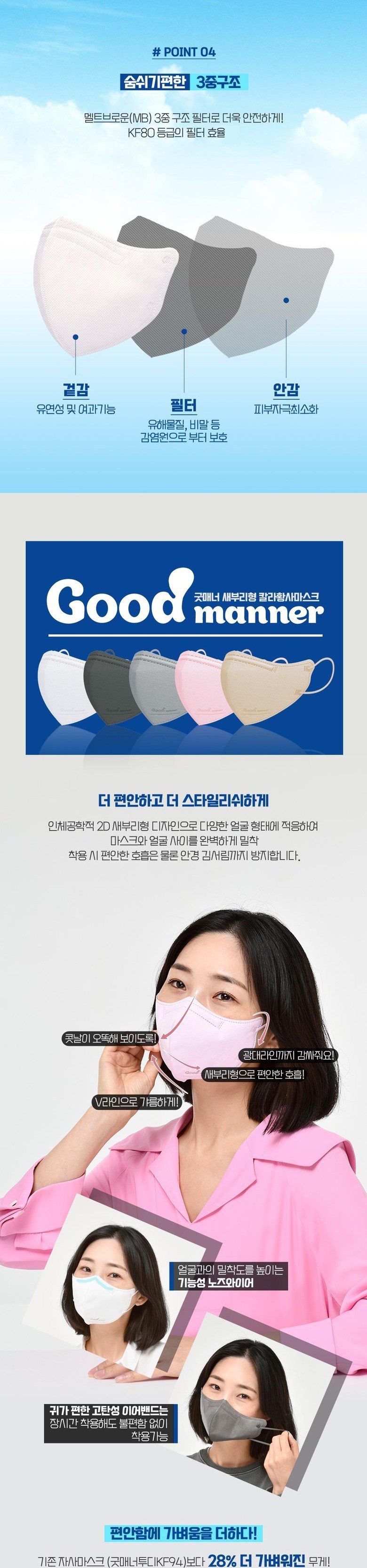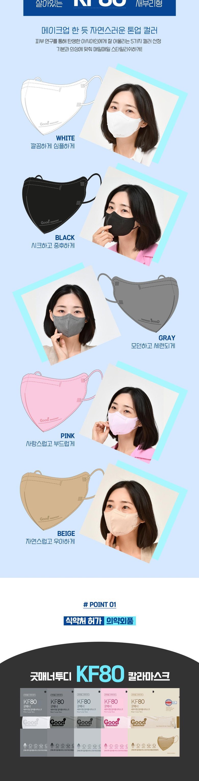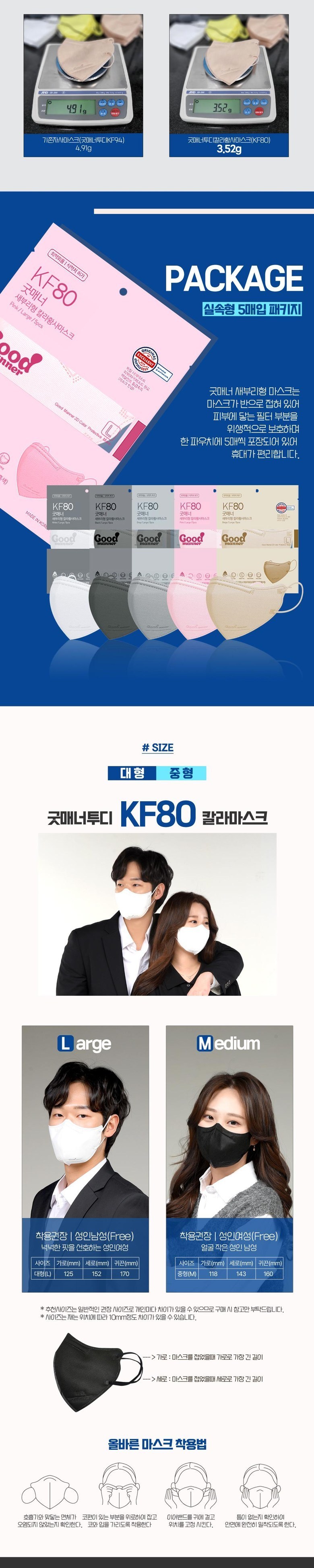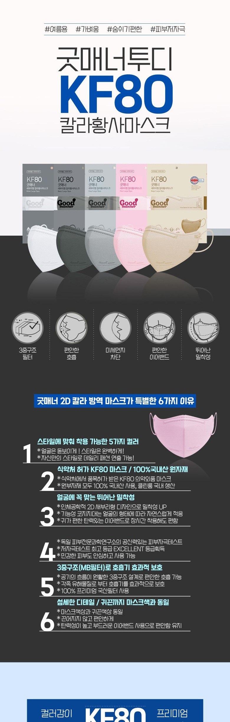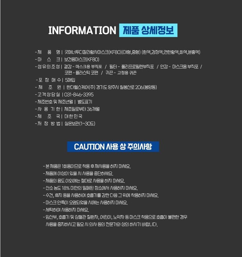 | 품명 및 모델명 | 굿매너투디칼라황사마스크(KF80)(중형)(흰색,검정색,연한황색,회색,분홍색) | 인증/허가 사항 | 의약외품 |