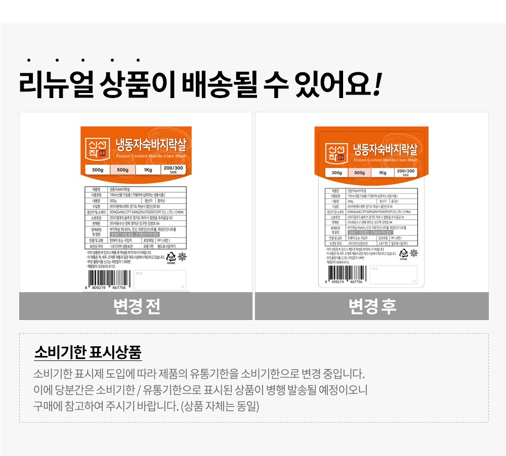 조개 껍데기를 분리하는 과정에서 일부 조각이 혼입될 수 있으니 섭취 시 주의 부탁드립니다.