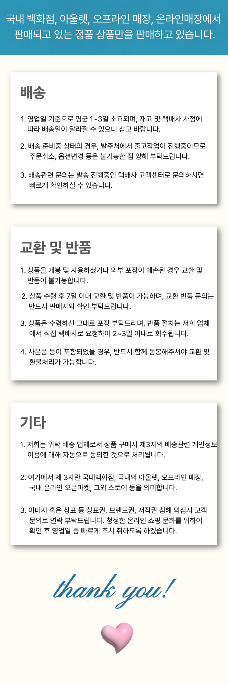 - ㆍ모니터 해상도의 차이로 인해 색상이나 이미지가 실제와 달라, 고객이 단순 변심으로 교환/반품을 무료로 요청하는 경우