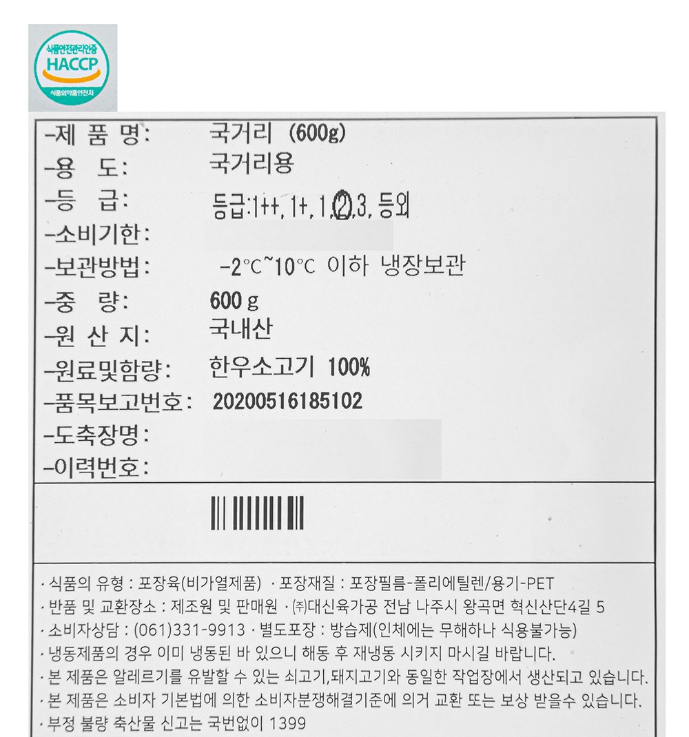 | 소비기한 또는 품질유지기한 | 소비기한(또는 유통기한) : 2026년 03월 09일 이거나 그 이후인 상품 | 세부 품목군별 표시사항 | 축산물 등급표시 : 2등급 / 이력번호 표시유무 : 이력번호 표시제품임 |