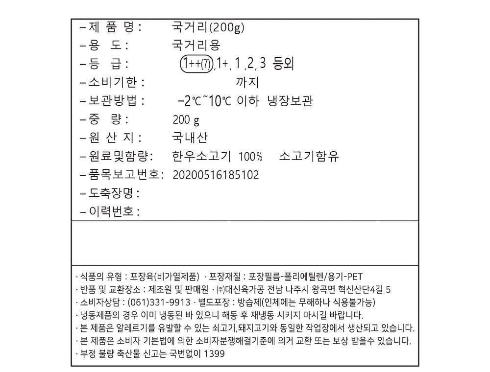 | 소비기한 또는 품질유지기한 | 소비기한(또는 유통기한) : 2026년 02월 02일 이거나 그 이후인 상품 | 세부 품목군별 표시사항 | 축산물 등급표시 : 1++등급(7) / 이력번호 표시유무 : 이력번호 표시제품임 |
