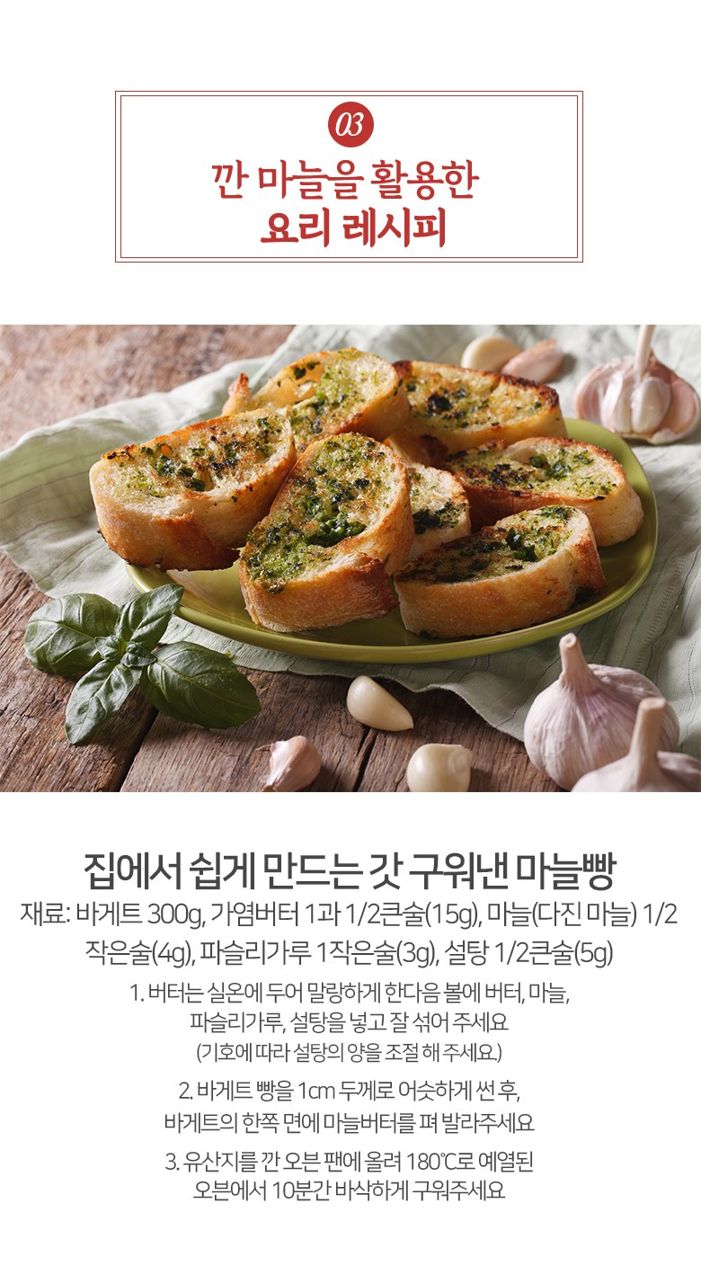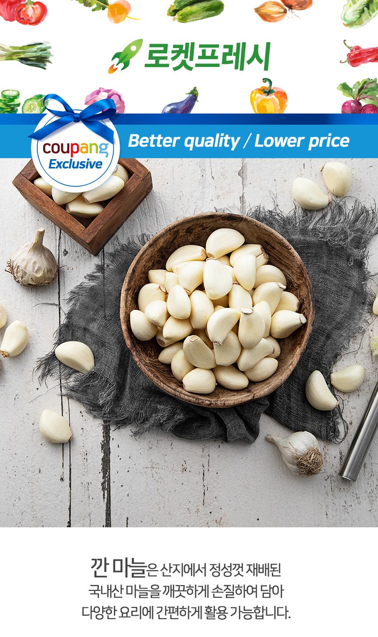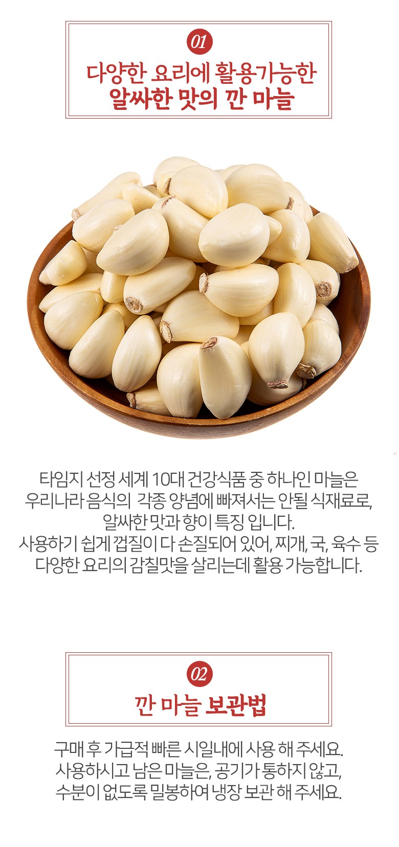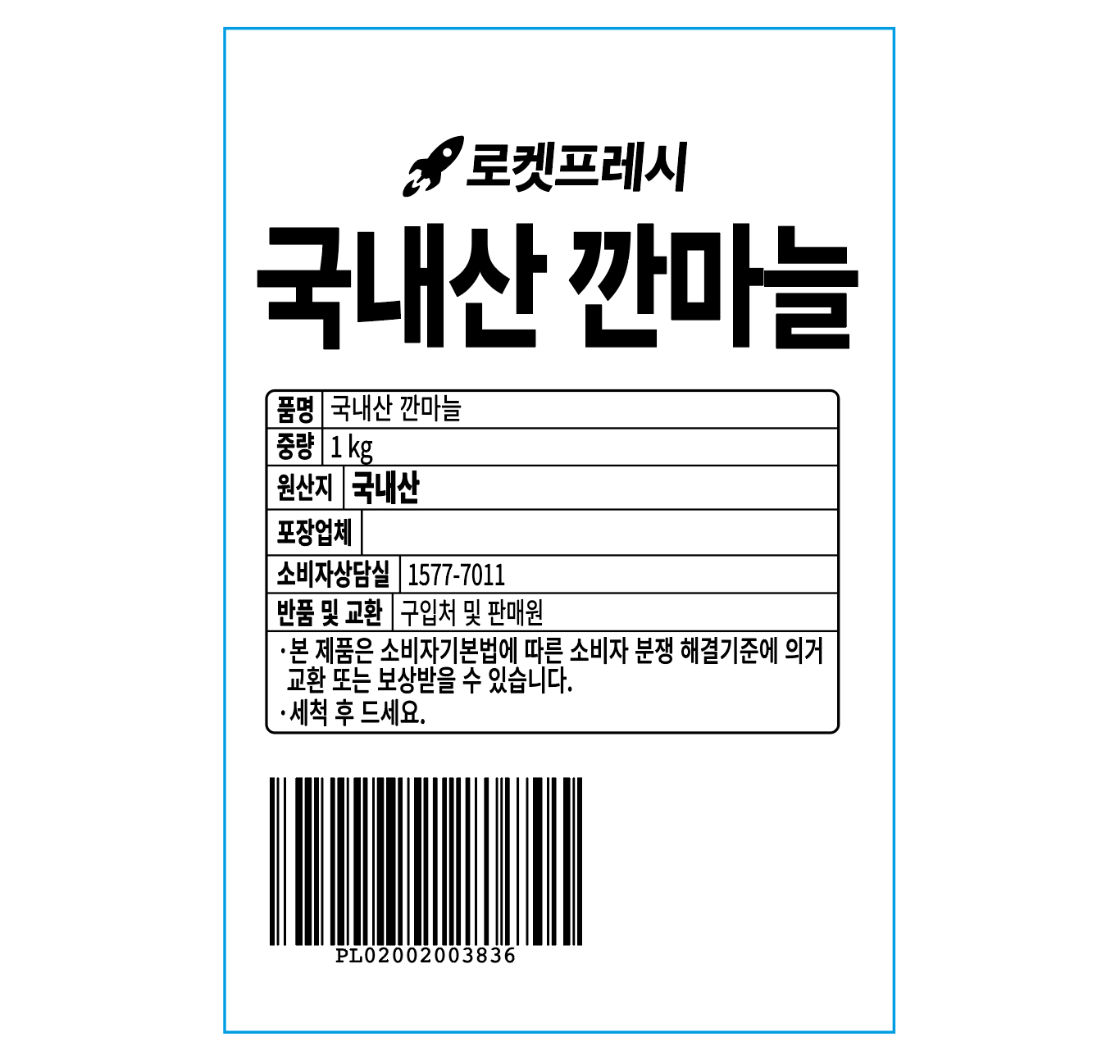 | 품목 또는 명칭 | 국내산 깐마늘 | 포장단위별 내용물의 용량(중량),수량,크기 | 1kgx1개 |