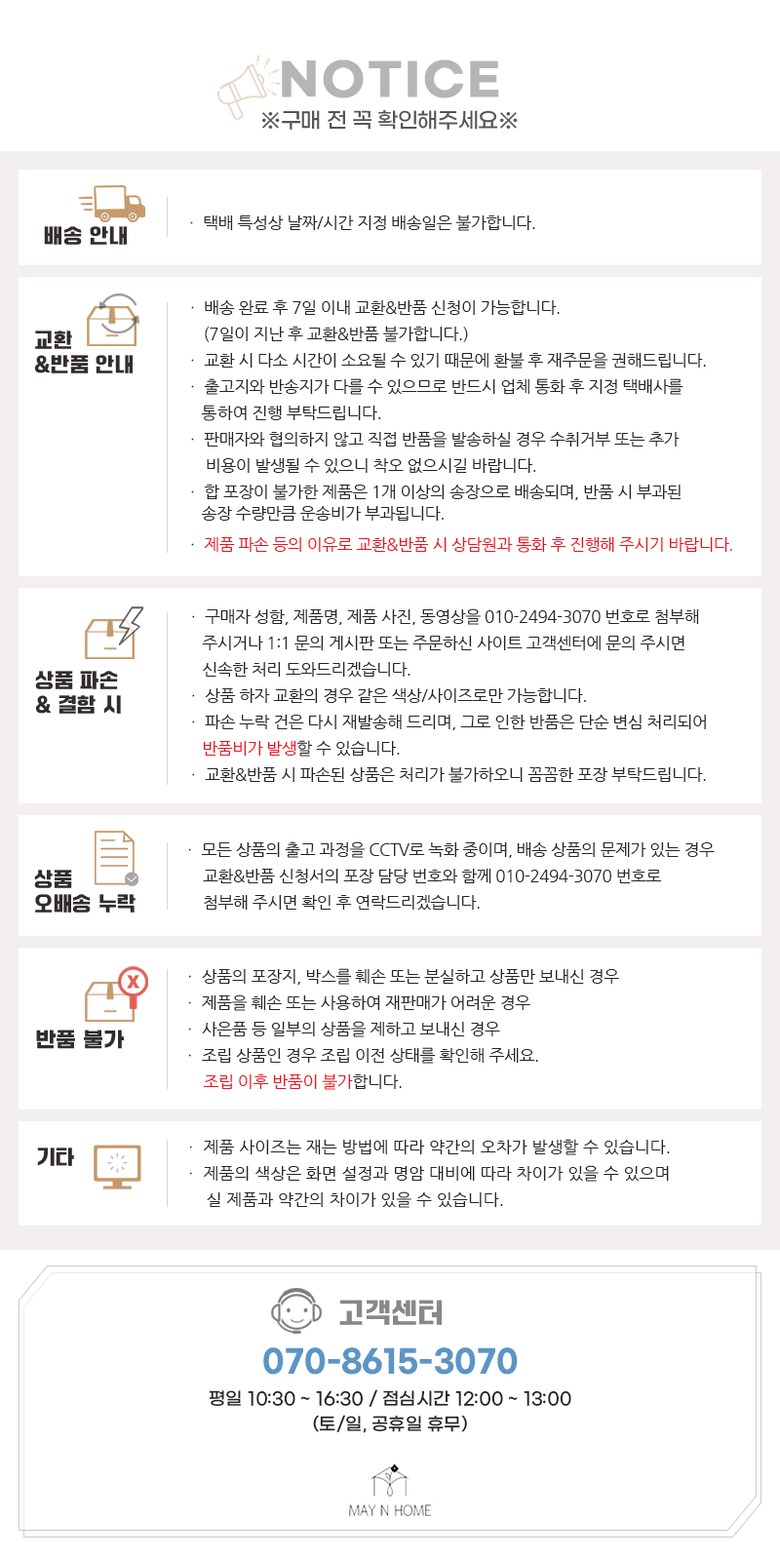 - ㆍ모니터 해상도의 차이로 인해 색상이나 이미지가 실제와 달라, 고객이 단순 변심으로 교환/반품을 무료로 요청하는 경우