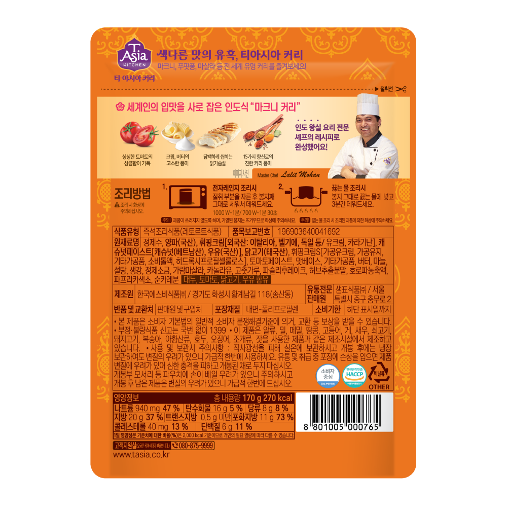 | 제품명 | 티.아시아 치킨마크니커리 | 식품의 유형 | 컨텐츠 참조 |