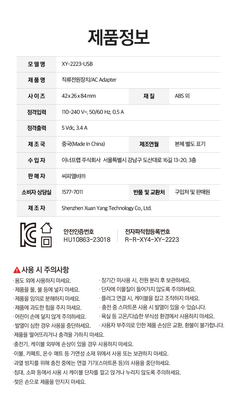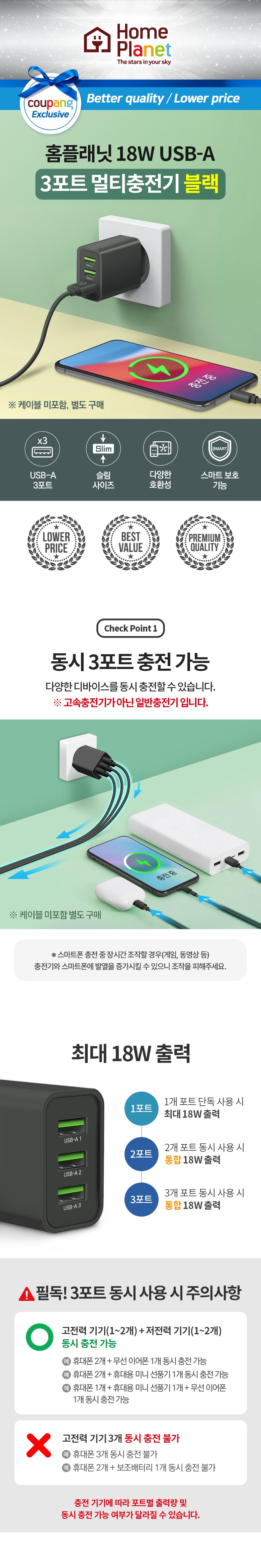 | 품명 및 모델명 | 홈플래닛 18W 3포트 멀티충전기 블랙, XY-2223-USB | KC 인증정보 | 안전인증 : HU10863-23018, 전자파적합등록 : R-R-XY4-XY-2223 |