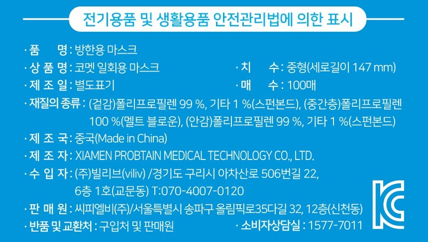 | 품명 및 모델명 | 코멧 일회용 마스크 화이트, 중형, 100개입 | 인증/허가 사항 | KC마크 |