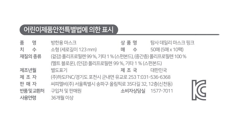 | 품명 및 모델명 | 탐사 데일리 마스크 핑크 소형 50개입 | 인증/허가 사항 | 유/KC마크 |