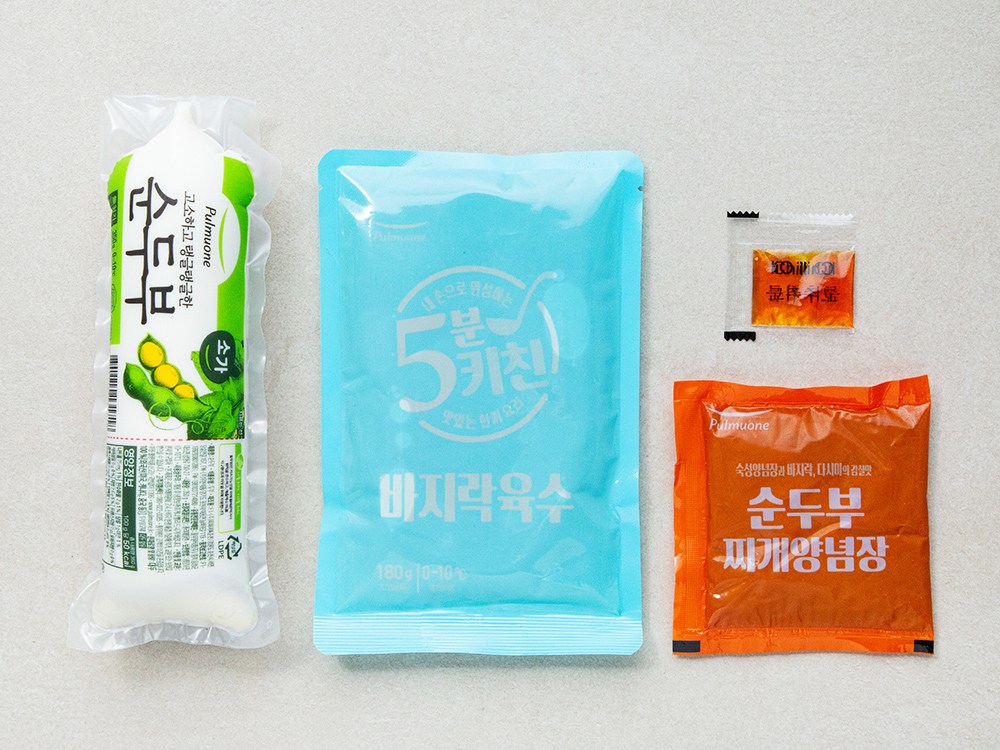 순두부, 바지락 육수, 칠리오일, 순두부찌개 양념장으로 구성되어 있습니다.