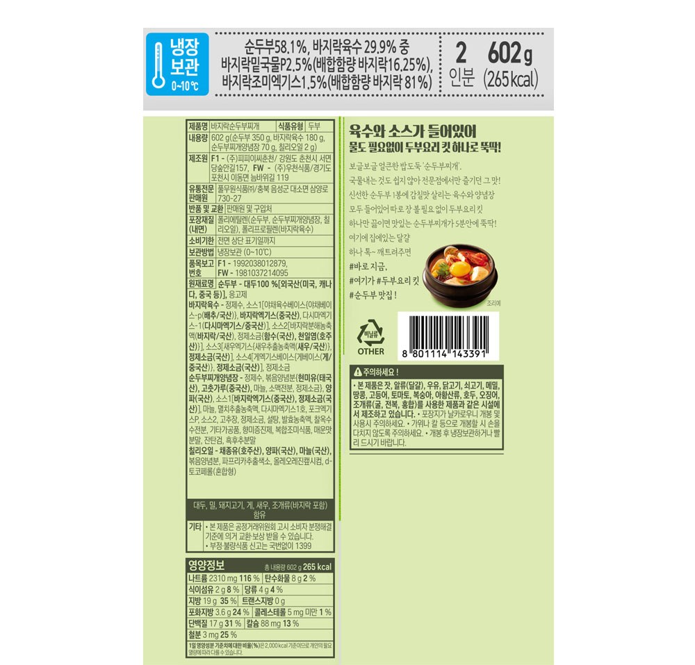 | 제품명 | 바지락 순두부 찌개 | 식품의 유형 | 컨텐츠 참조 |