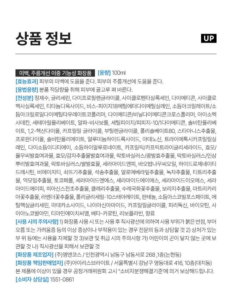 | 화장품제조업자, 화장품책임판매업자 및 맞춤형화장품판매업자 | 상품 상세페이지 참조 | 제조국 | 상품 상세페이지 참조 |