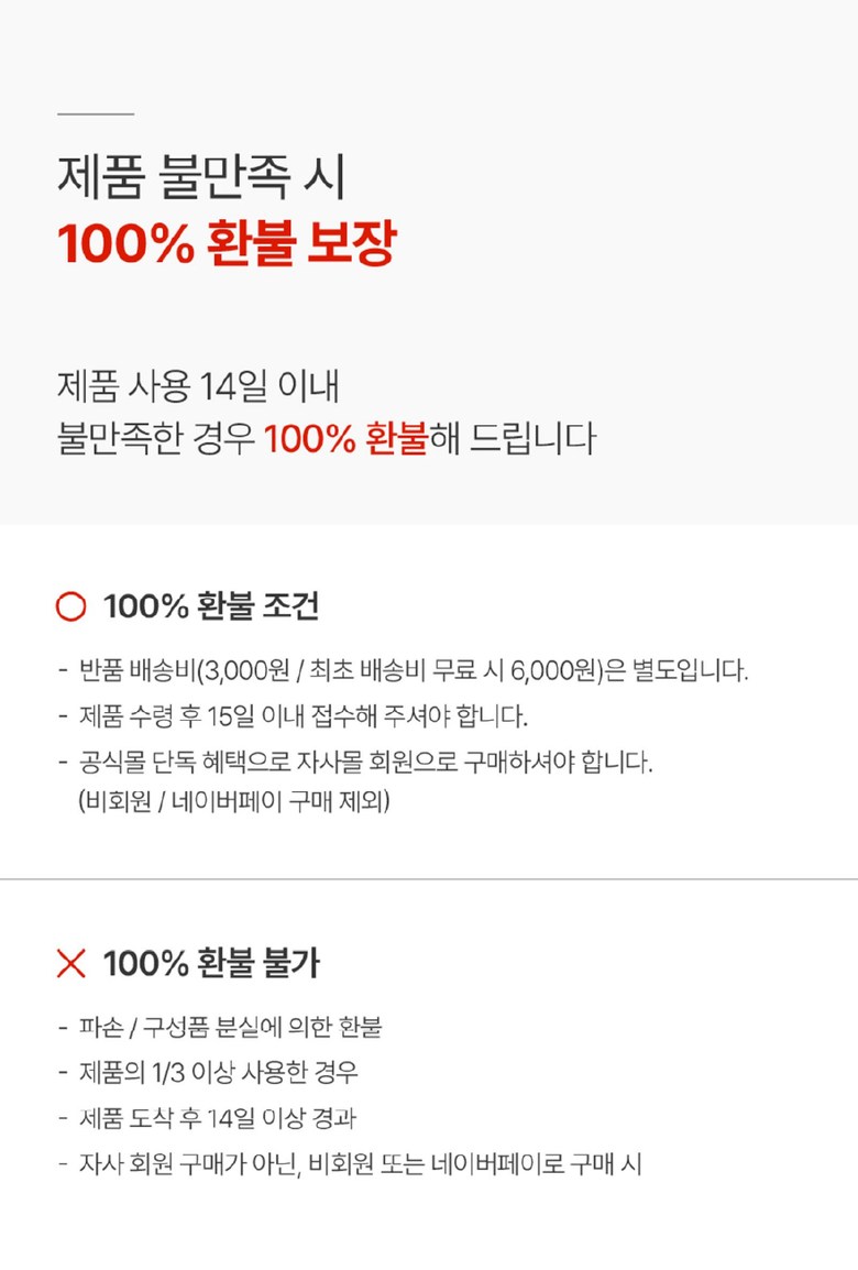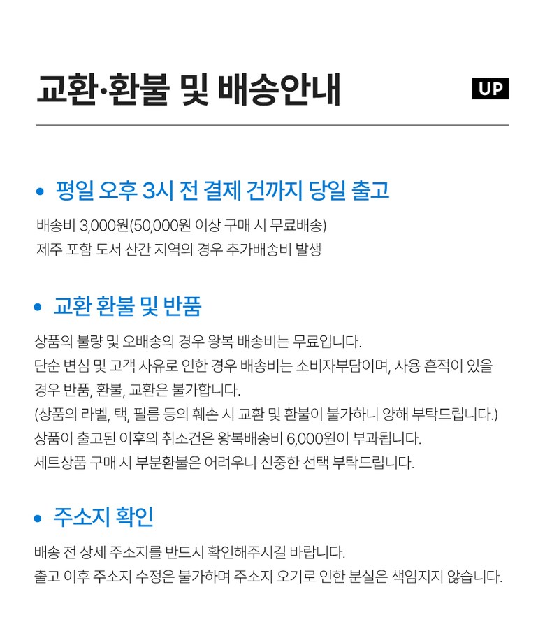 | 교환/반품 비용 (왕복비용) | 6,000원 - 단, 고객 변심의 경우에만 발생 - 도서산간 및 일부 지역 추가비용 발생 |
