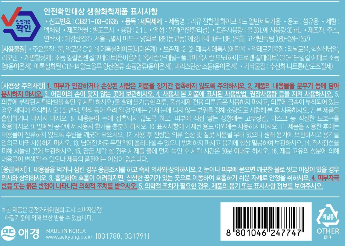 | 품목 및 제품명 | 세탁세제 / 리큐 진한겔 하이브리드 일반세탁기용 | 용도(표백제의 경우 계열을 함께표시) 및 제형 | 섬유용 / 액체형 |