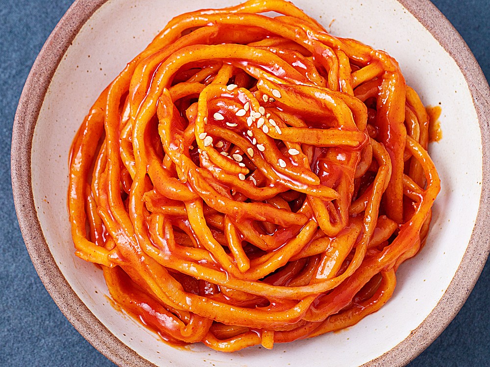 양념: 간장 2큰술, 고추장 3큰술, 물엿 3큰술, 마요네즈 1큰술, 고춧가루 0.5큰술, 다진 마늘 1큰술, 참기름 약간, 통깨 약간