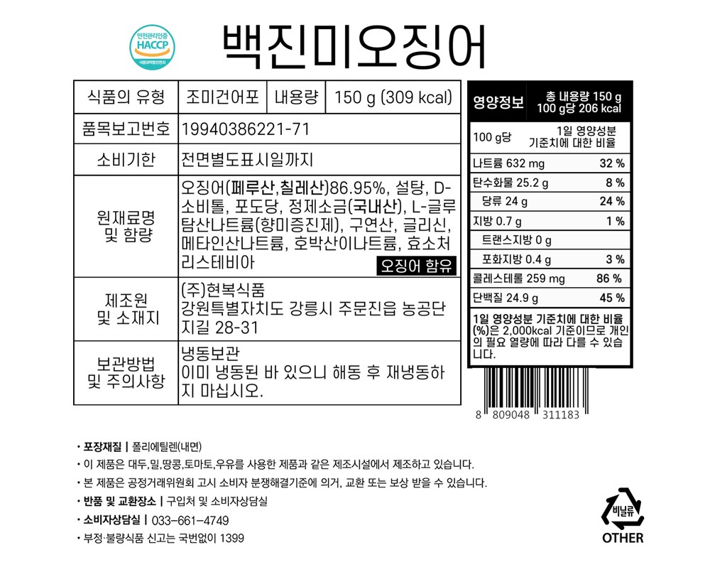 | 제품명 | 리뉴얼 전 : 백진미오징어채 / 리뉴얼 후 : 백진미오징어 | 식품의 유형 | 컨텐츠 참조 |