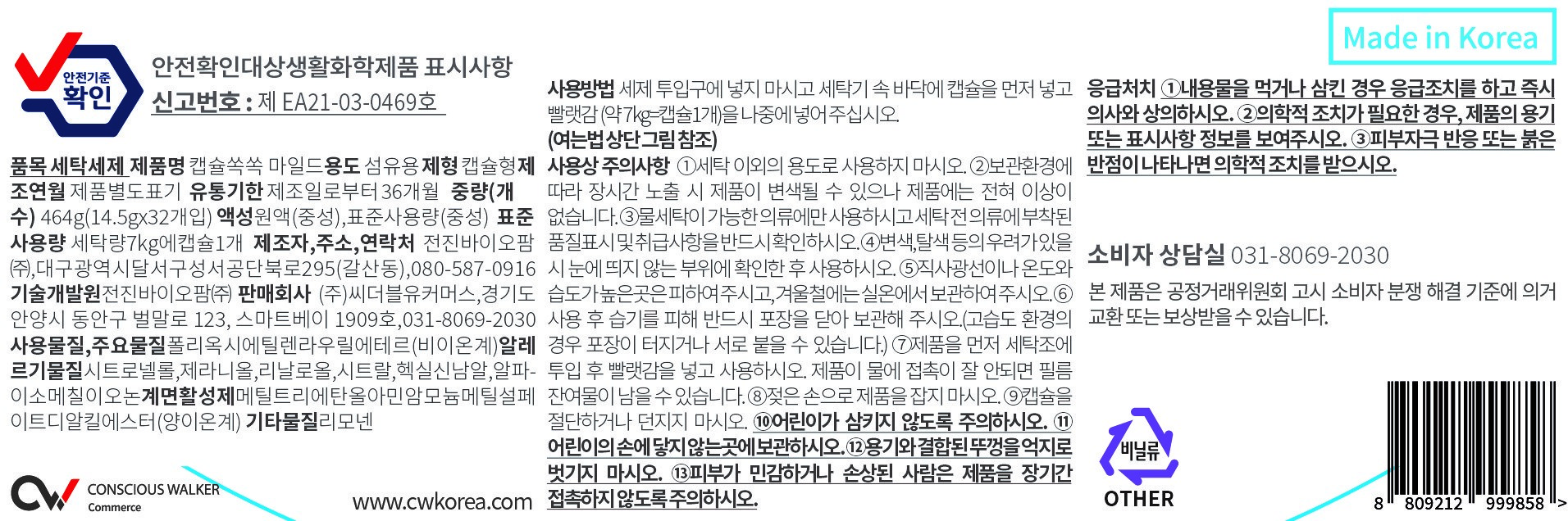 | 품목 및 제품명 | 세탁세제 / 캡슐쏙쏙 마일드 | 용도(표백제의 경우 계열을 함께표시) 및 제형 | 섬유용 / 비분사형-캡슐형 |